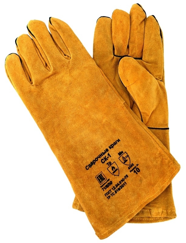 Краги сварщика изготовлены из натуральной кожи. Это специальный огнестойкий материал с высокой стойкостью к истиранию, порезу, разрыву и проколу. Он также выдерживает воздействие брызг раскаленного металла. Цвет — желтый. Размер — 10/XL.