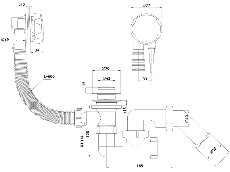 — Для ванн с отверстием слива Ø50 мм и отверстием перелива от Ø48 до 56 мм (стандартное отверстие 50 мм).