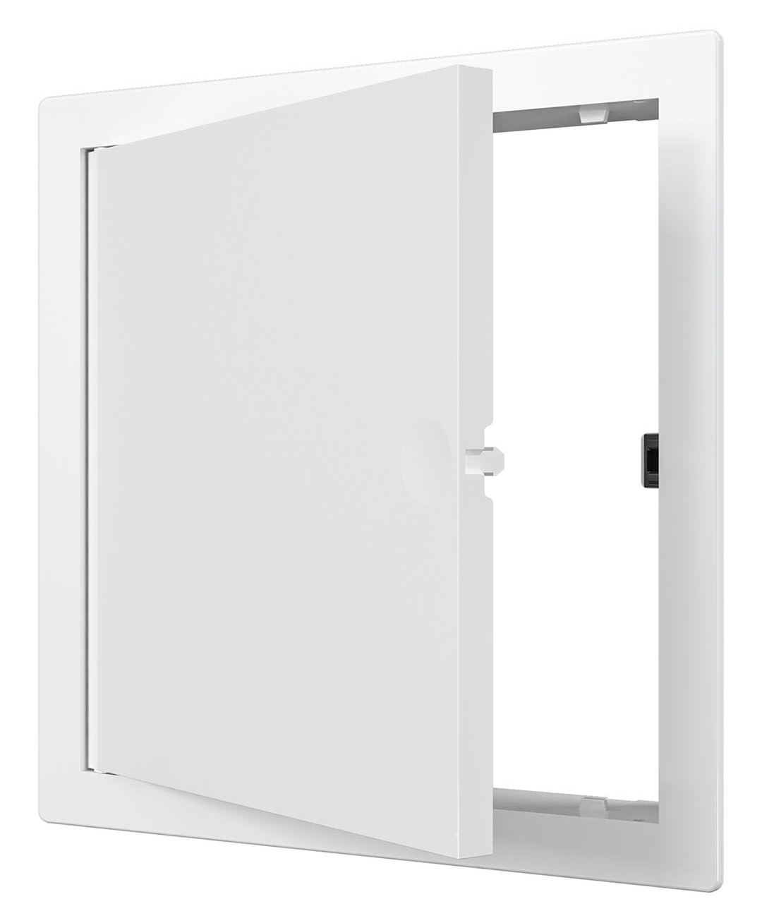 Благодаря встроенному механизму люк открывается и закрывается легким надавливанием на углубление в дверце. Замок выдерживает до 30000 нажатий, эксплуатируется при температуре от — 10 до + 50С. Нажимной замок фиксирует дверцу, не позволяя ей самопроизвольно открываться, за счет чего люк устанавливается не только в стену, но и в потолок. Монтаж производится с учетом левостороннего или правостороннего открывания. Люк крепится с помощью клея или саморезов.