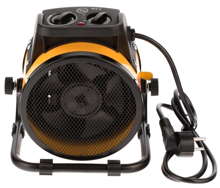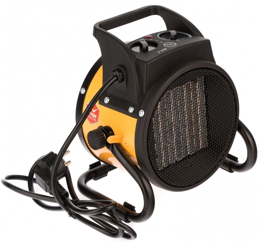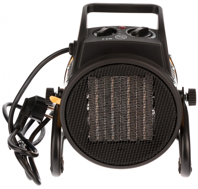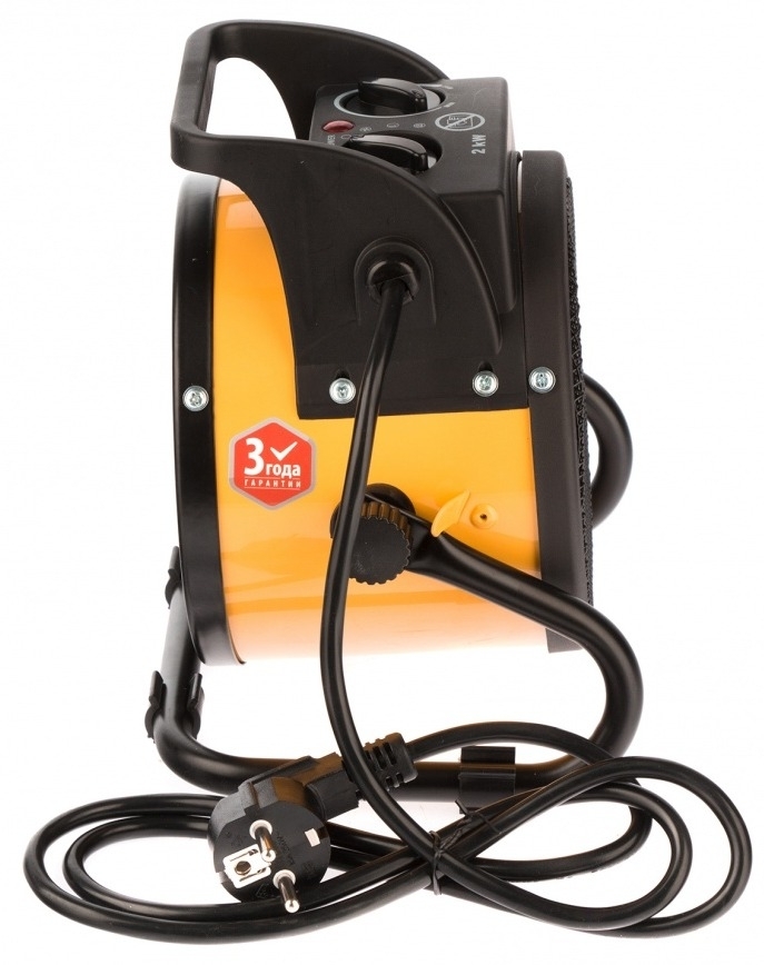 Тепловая пушка (тепловентилятор) Denzel DHC 2-100 96429 с керамическим нагревателем потребляет мощность 0,025, 1 или 2 кВт и пригодится в любую погоду: в холод она обогреет помещение, а в жару ее можно использовать как вентилятор. Работа тепловой пушки не доставляет дискомфорт, безопасна для здоровья людей и животных, поскольку керамический нагревательный элемент не сушит воздух и не выделяет вредных веществ.