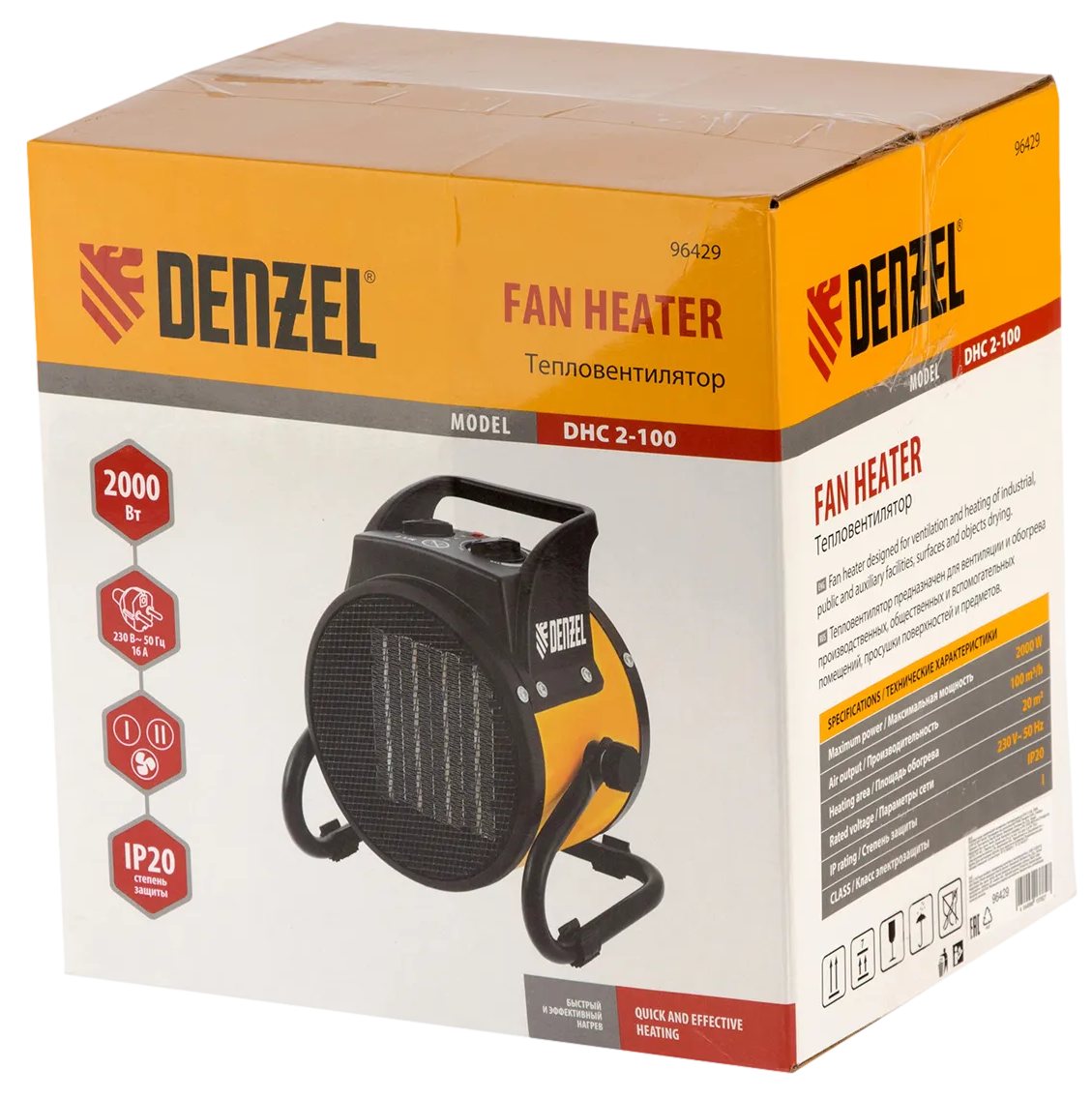 Тепловая пушка Denzel / Дензел DHC 2-100 электрическая, в стальном корпусе, 210x160x217мм, 2кВт, 20м², 100м³/ч, IP 20 / отопление