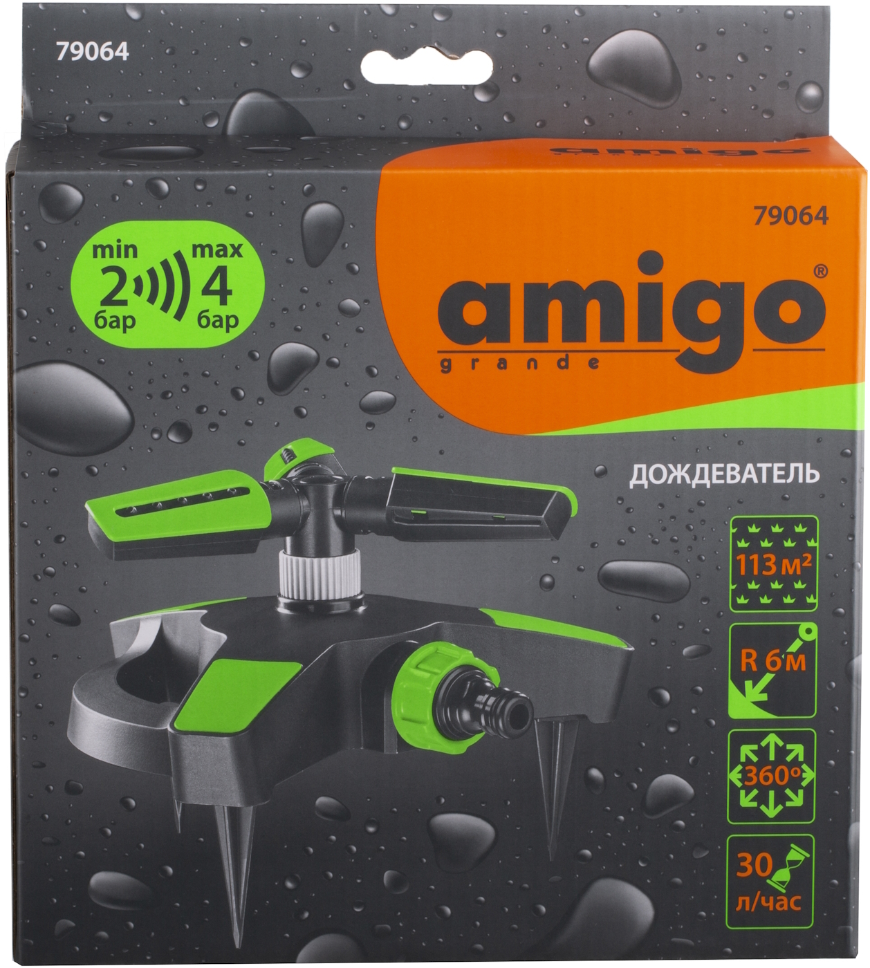 Вращающийся дождеватель круговой Amigo 79064 имеет устойчивую платформу и регулировку распыления. Площадь распыления -113 м2. Расход воды -30 л/мин. Рабочее давление — 2/4 атм.