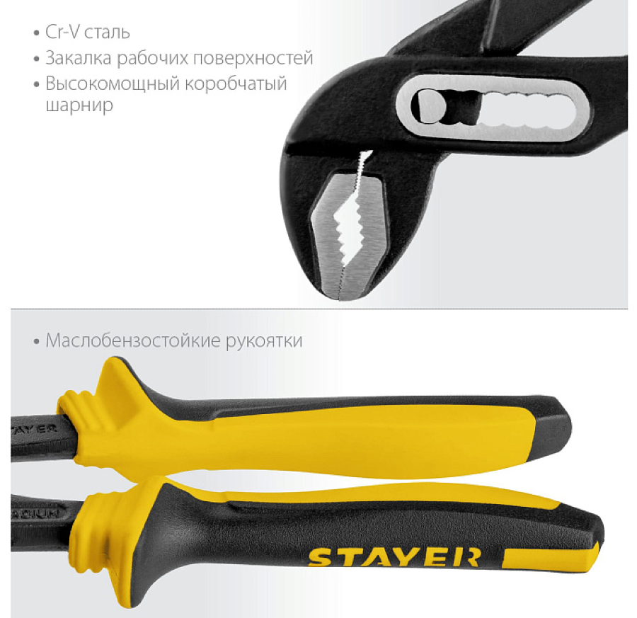 Клещи переставные Stayer Hercules-Х сочетают в себе мощь традиционного ключа с адаптивностью современного инструмента. Они станут практичным решением для профессионального и бытового применения.