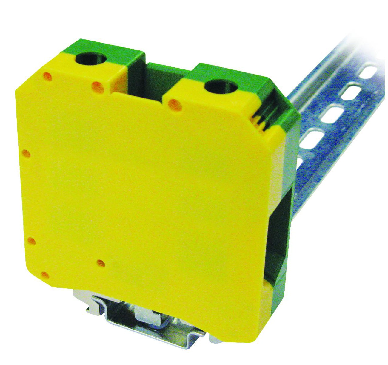 Закрытый корпус клеммы выполнен из диэлектрика желто-зеленого цвета.