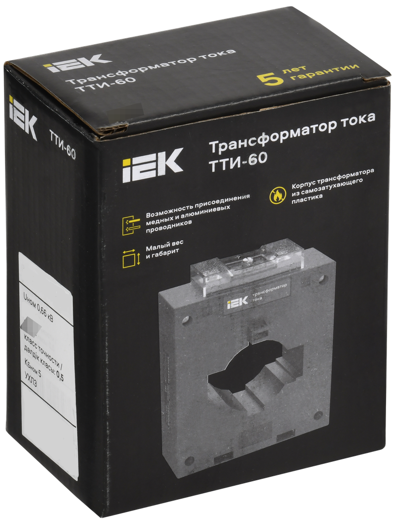 Трансформатор электрического тока IEK ТТИ-60 реализуется в индивидуальной упаковке. Он выполнен в корпусе из самозатухающего пластика.