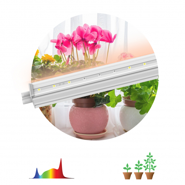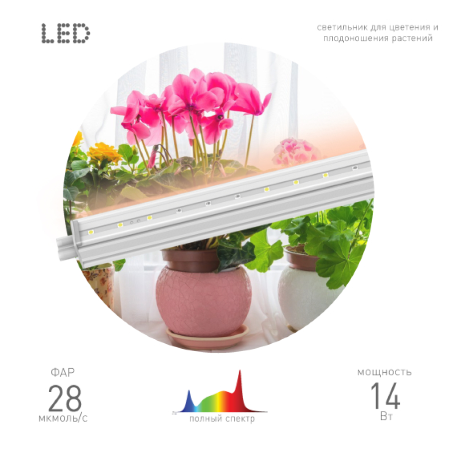 Светодиодная фитолампа ЭРА FITO-14W-Т5-Ra90 — настоящий помощник для садоводов и любителей комнатных растений. В плохо освещенных помещениях, в период короткого светового дня растения могут плохо расти, болеть и сохнуть. Чтобы этого не допустить, рекомендуем использовать фитосветильники.
