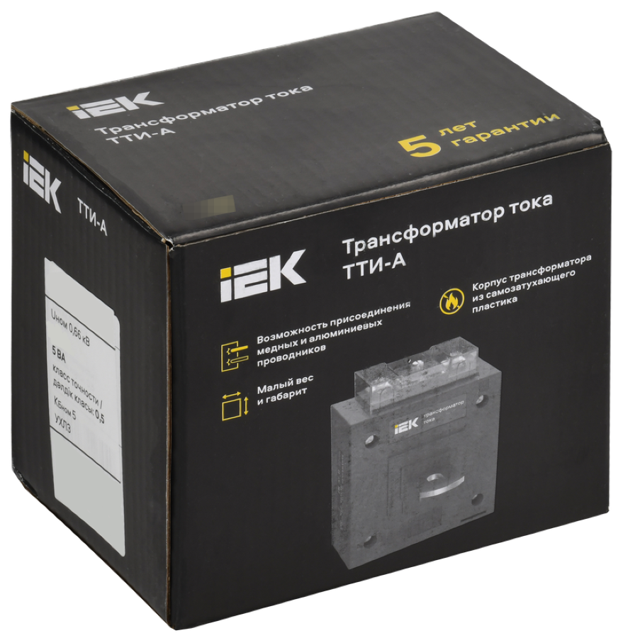 Трансформатор электрического тока IEK ТТИ-А реализуется в индивидуальной упаковке. Он выполнен в корпусе из самозатухающего пластика.