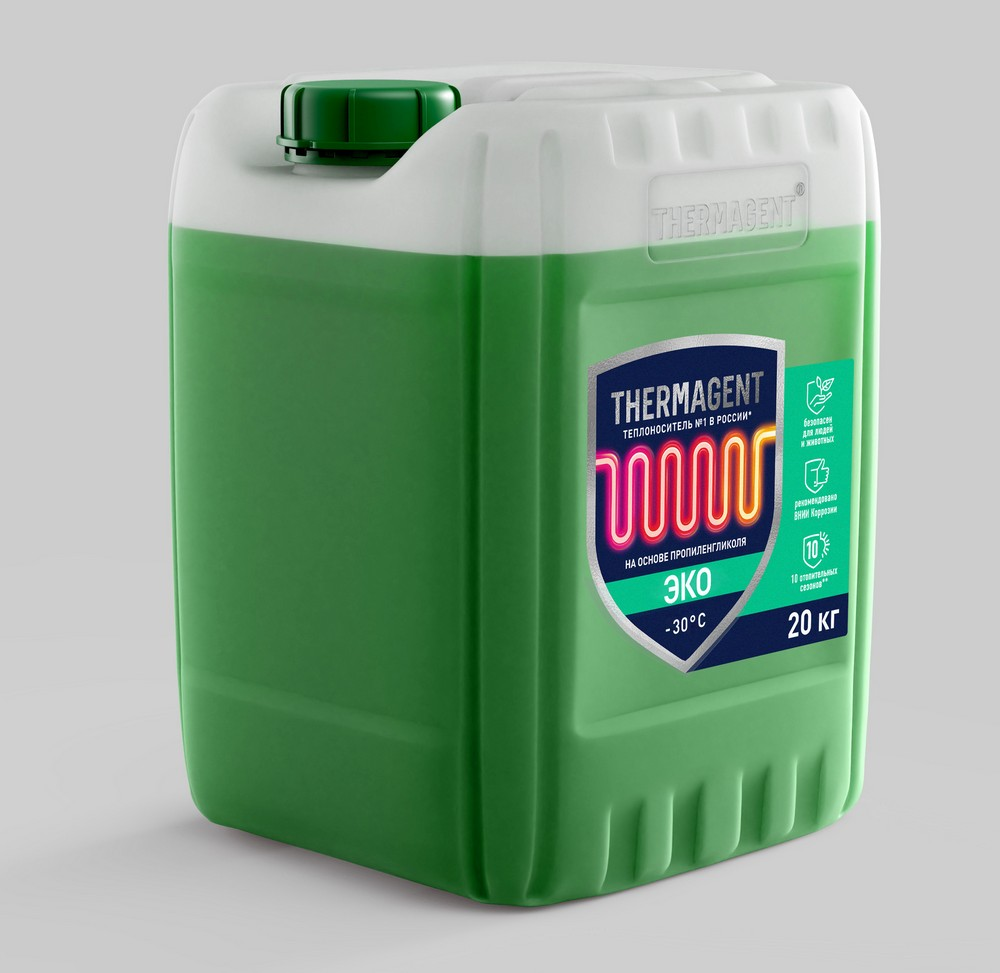Теплоноситель Thermagent ЭКО на основе пропиленгликоля (безвреден для людей и окружающей среды) с органическими ингибиторами коррозии. Срок службы — 10 лет. Подходит для систем отопления, кондиционирования и холодильного оборудования. Рабочий диапазон температур: от –30°C до 106°C. Не рекомендуется для электролизных котлов и систем с оцинкованными трубами.