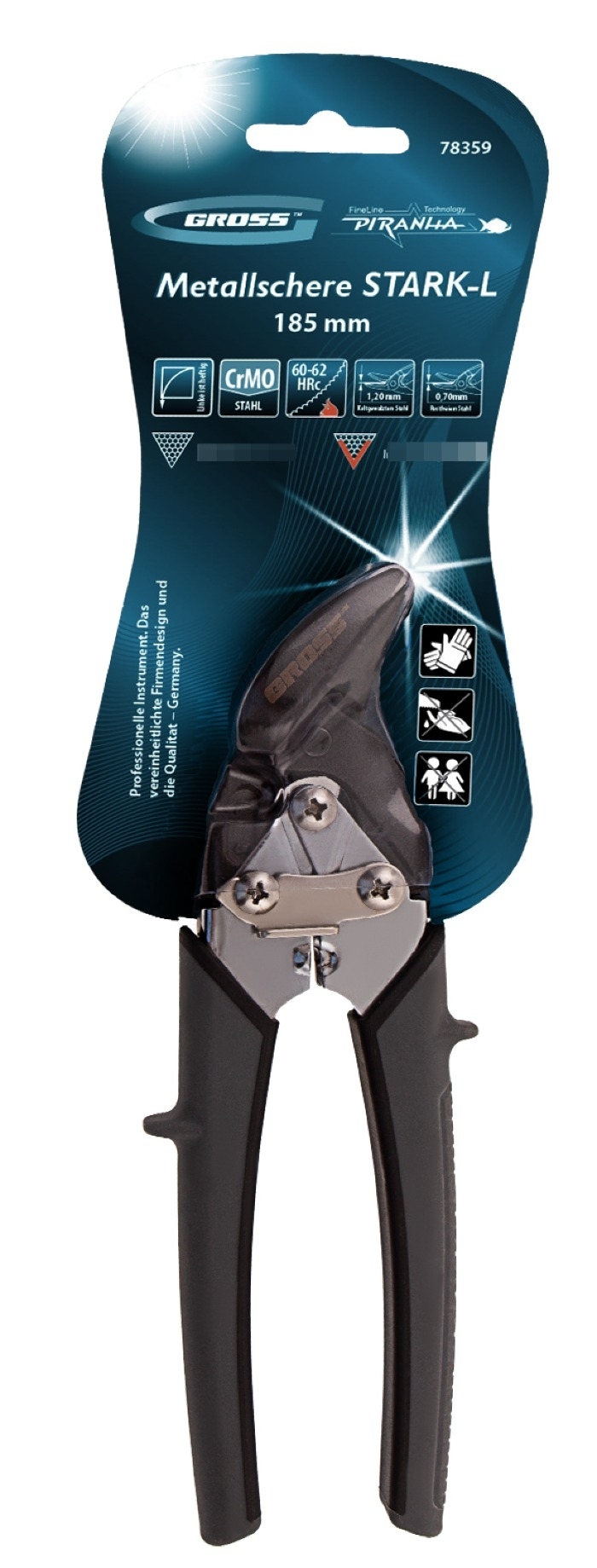Ножницы по металлу Gross PIRANHA 78359 длиной 185 мм, из стали CrMo, с двухкомпонентными рукоятками, предназначены для прямого и криволинейного левого резания листовых заготовок.