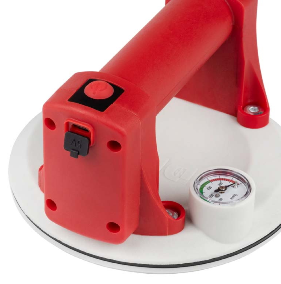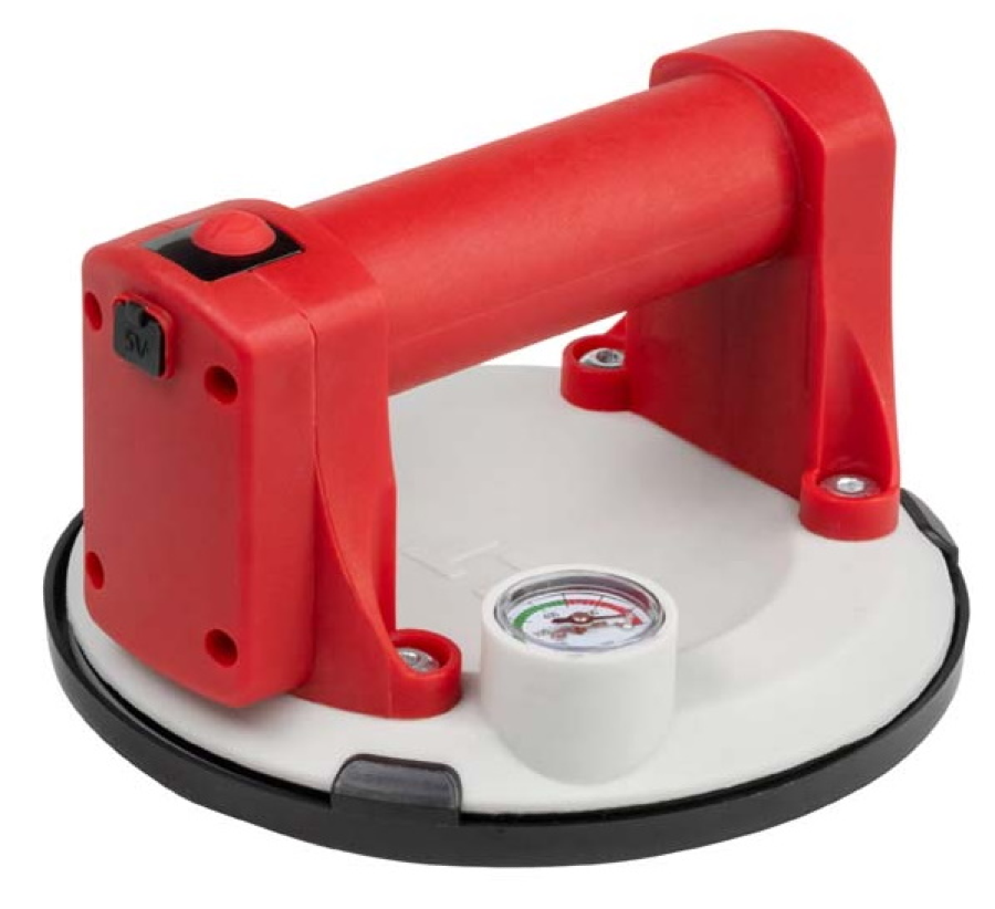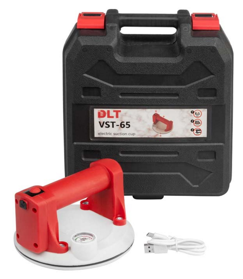 Присоска DLT VST-65 оснащена встроенным электрическим насосом, датчиком давления и манометром давления для визуального контроля. Датчик давления анализирует силу разрежения воздуха и автоматически включает насос, когда требуется восстановить необходимые параметры вакуума (автоматическая подкачка).
