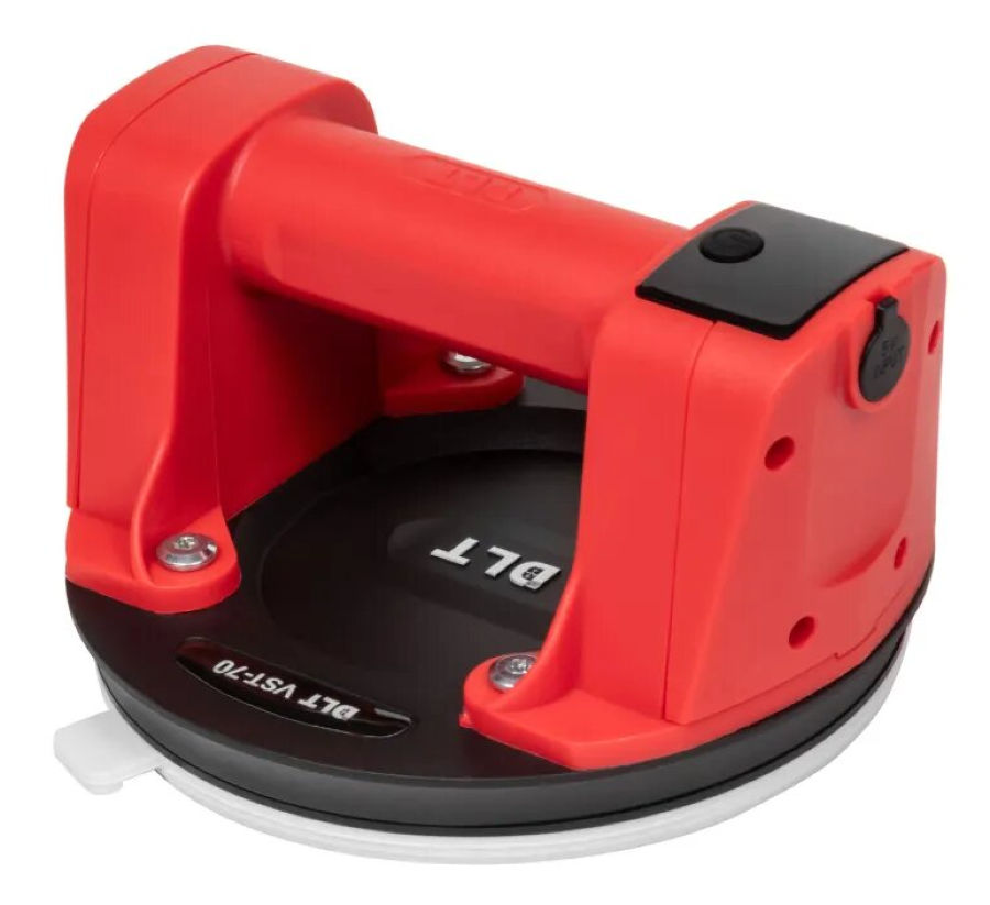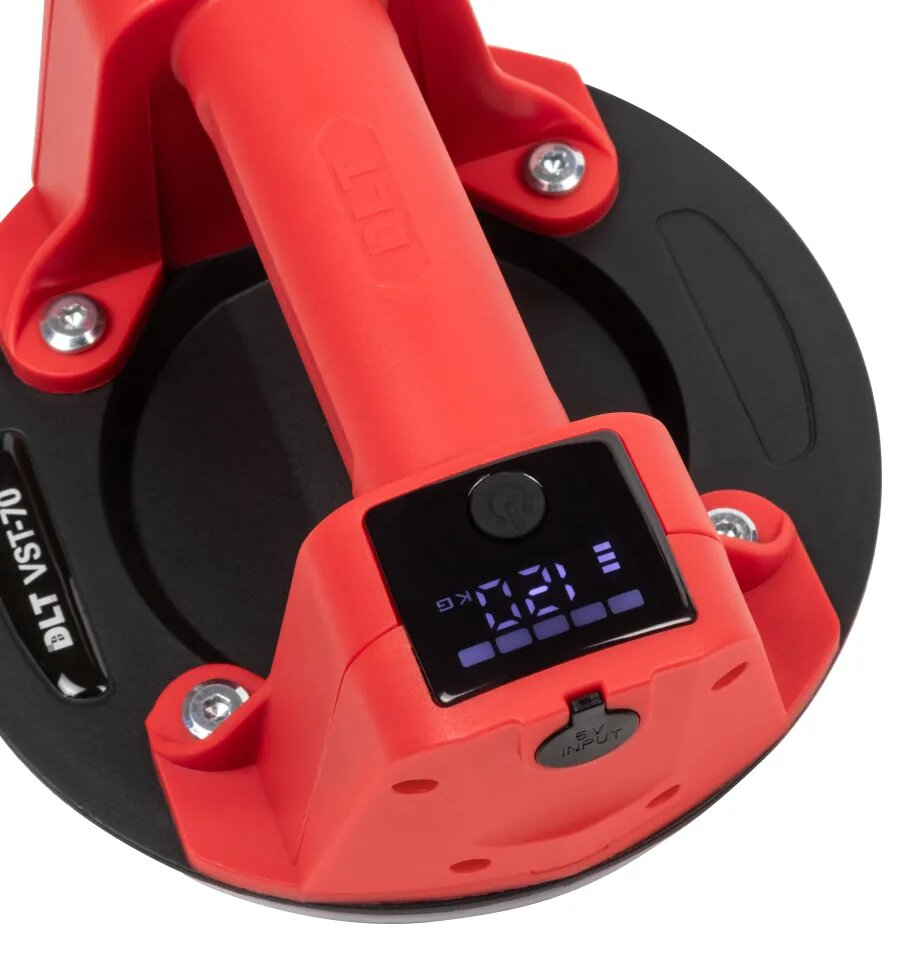 Присоска DLT VST-70 оснащена встроенным электрическим насосом, датчиком давления, дисплеем для визуального контроля уровня заряда батареи и массы удержания. Датчик давления анализирует силу разрежения воздуха и автоматически включает насос, когда требуется восстановить необходимые параметры вакуума (автоматическая подкачка).