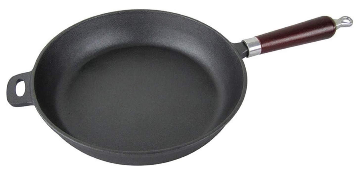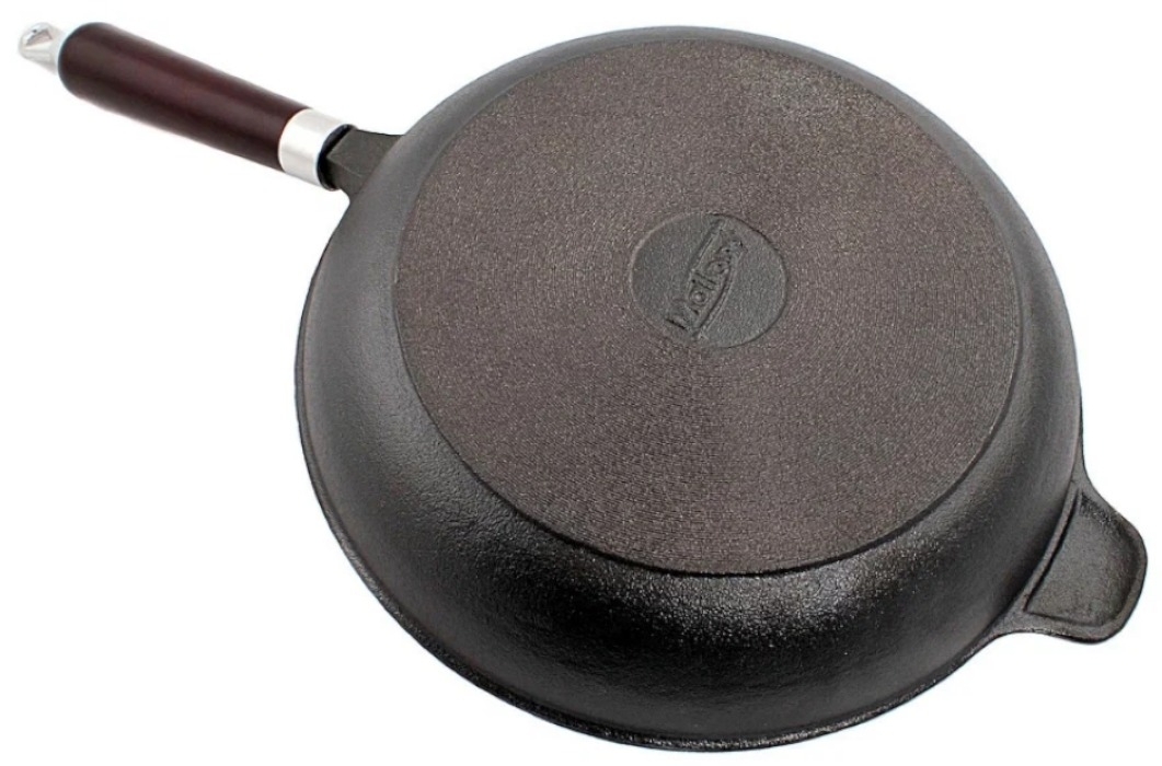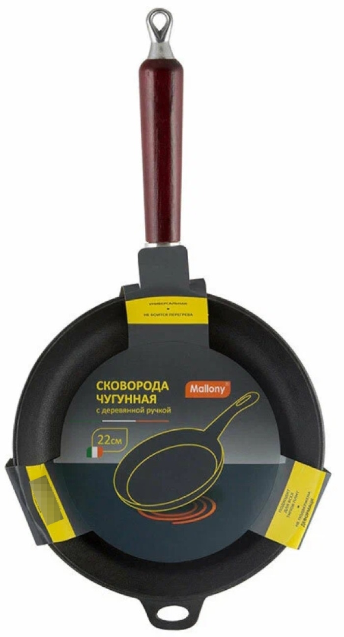 Высота бортов сковороды чугунной Mallony в 4 см при диаметре 22 см оптимальна для тушения и жарки различных блюд.