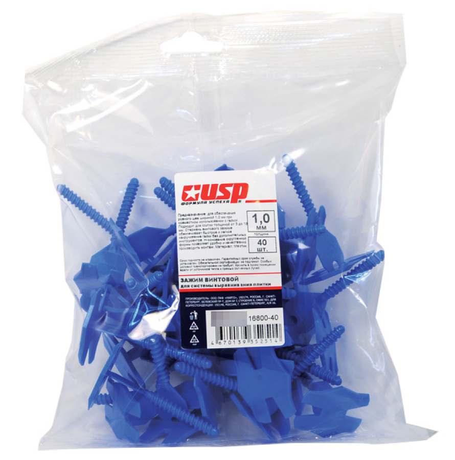 Зажим для выравнивания плитки USP / УСП винтовой, пластиковый, синий, 1мм, 40шт. / строительство и ремонт