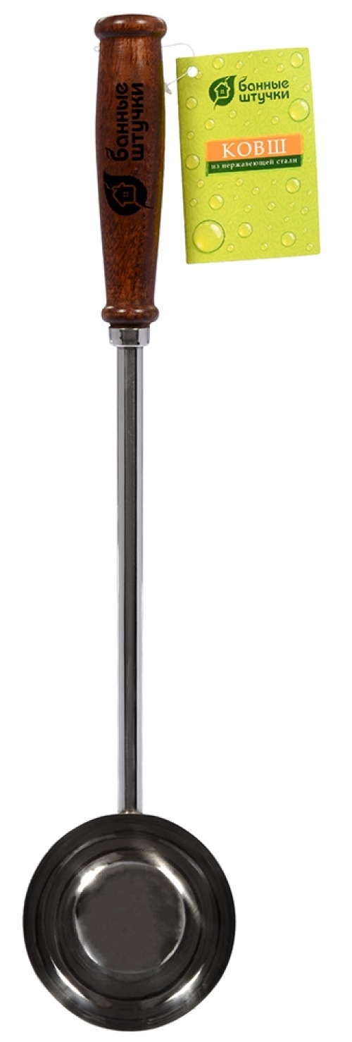 Ковш для бани реализуется в индивидуальной упаковке. Изготовлен из нержавеющей стали и дерева. Длина — 45 см.