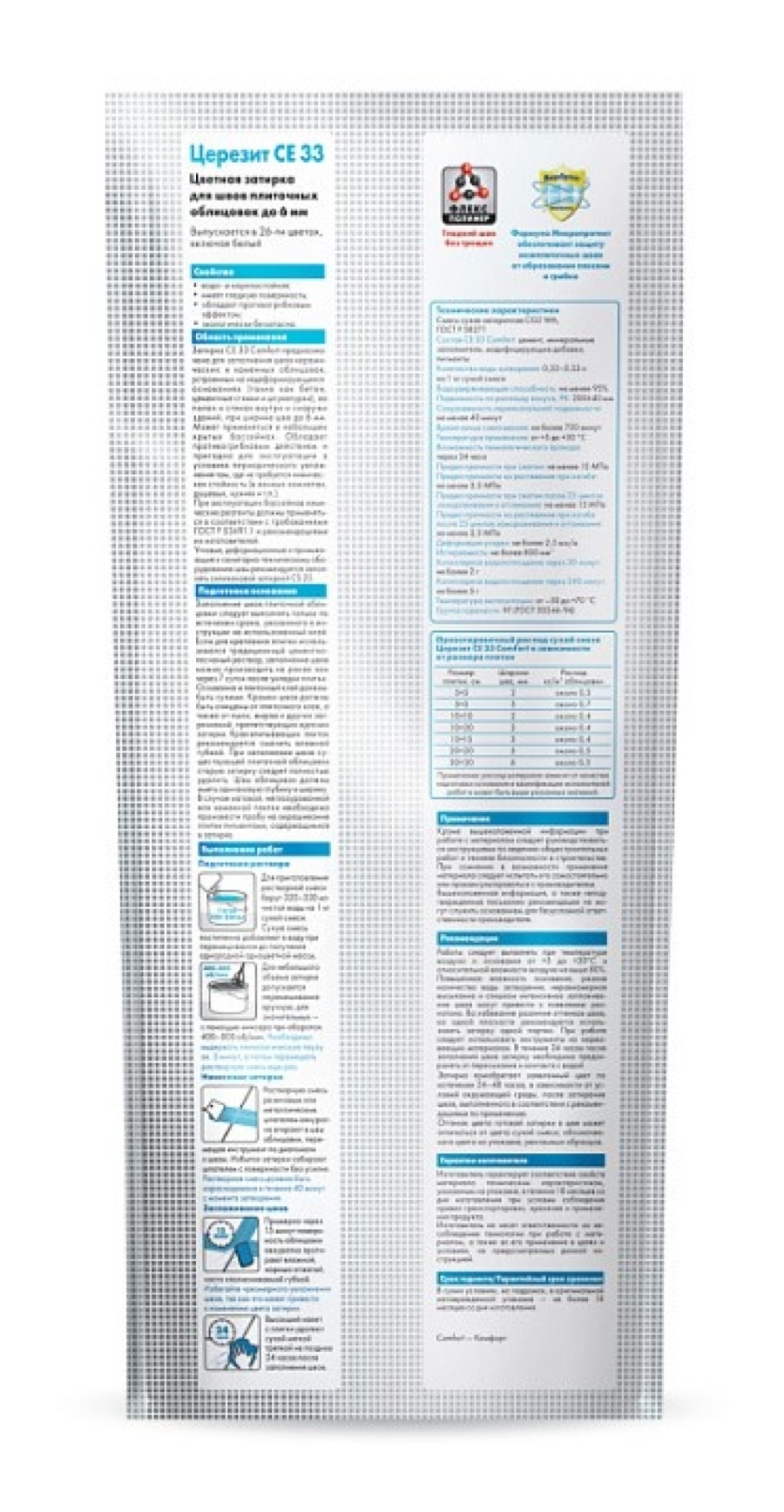 Затирка Ceresit СЕ33 Comfort предназначена для заполнения швов керамических и каменных облицовок, устроенных на недеформирующихся основаниях (таких как бетон, цементные стяжки и штукатурки), на полах и стенах внутри и снаружи зданий, при ширине шва до 6 мм.