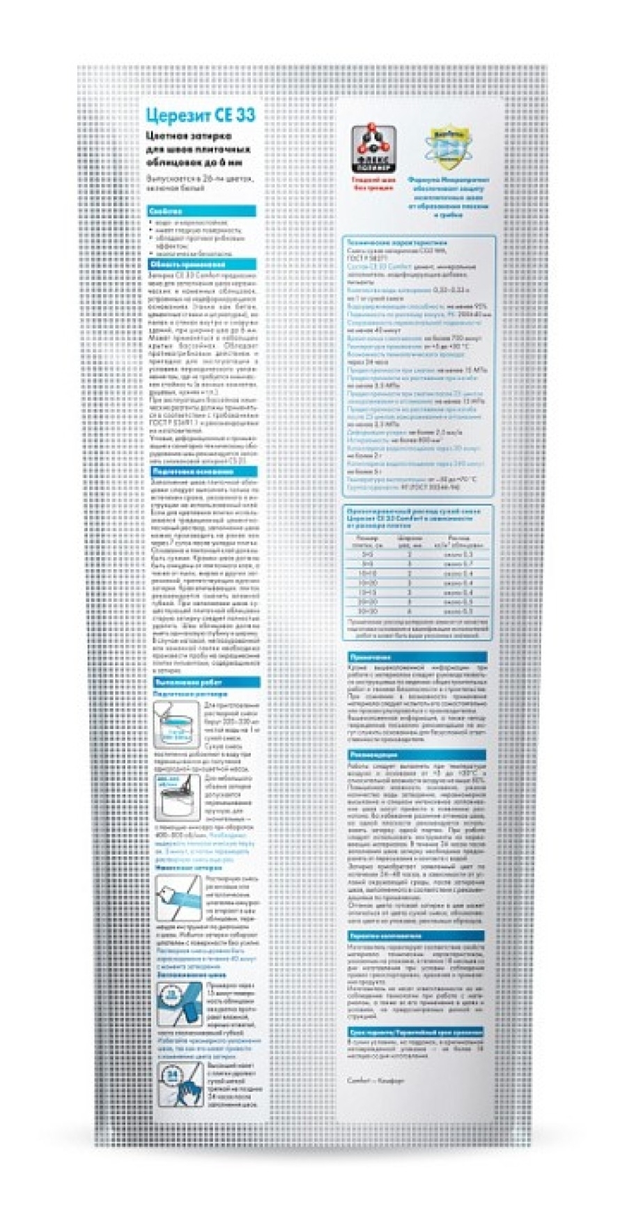 Затирка Ceresit СЕ33 Comfort предназначена для заполнения швов керамических и каменных облицовок, устроенных на недеформирующихся основаниях (таких как бетон, цементные стяжки и штукатурки), на полах и стенах внутри и снаружи зданий, при ширине шва до 6 мм.