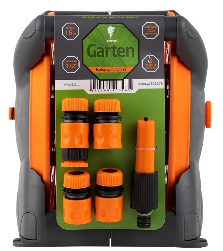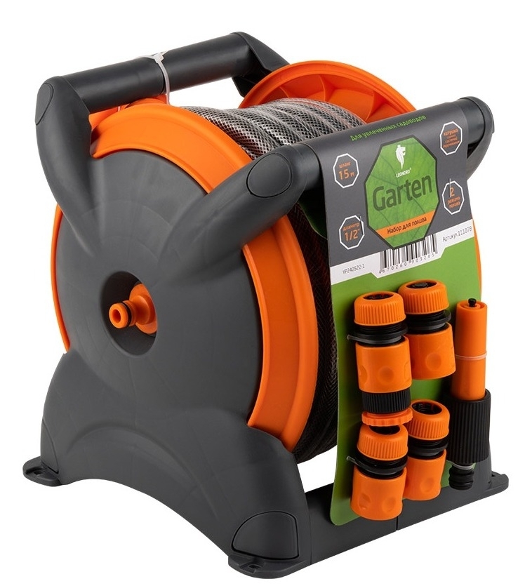 — Шланг 3-х слойный ПВХ, длина 15 м, диаметр ½, 3 шт соединителей ½, 1 шт соеденитель с аквастопом ½, 1шт адаптер с переходником ½-¾, 1 шт насадка для полива.