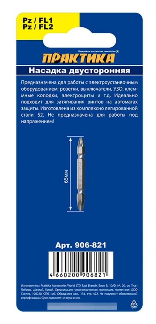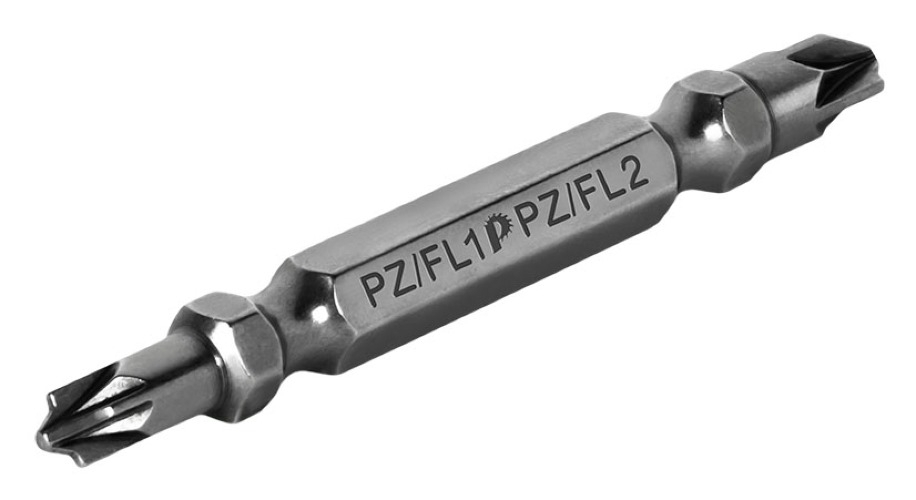 Бита Практика PZ/FL1-PZ/FL2 для электротехнических работ 65мм (2шт) двухсторонняя(блистер) (906-821)предназначена для работы с электроустановочным оборудованием: розетки, выключатели, УЗО, клеммные колодки, электрощиты/электрошкафы и т.д. Идеально подходит для затягивания винтов на автоматах защиты. Изготовлена из комплексно легированной стали S2. Упрочнена токами высокой частоты (ТВЧ). Не предназначена для работы под напряжением.