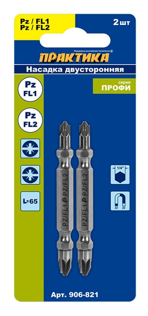 Бита Практика Профи двухсторонняя, для шуруповерта, из легированной стали S2, PZ/FL1-PZ/FL2, 65мм, 2шт. / инструменты
