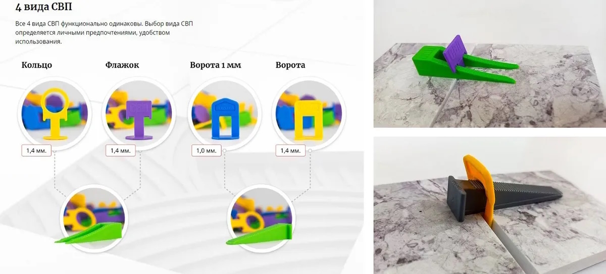Предназначен для одноразового пользования: после высыхания клея выбивается и обламывается точно у основания благодаря техническому срезу. Используется в комплекте с клином. Система Выравнивания Плитки (СВП) помогает уложить плитку быстро и ровно. Используется профессионалами и для ремонта своими силами.