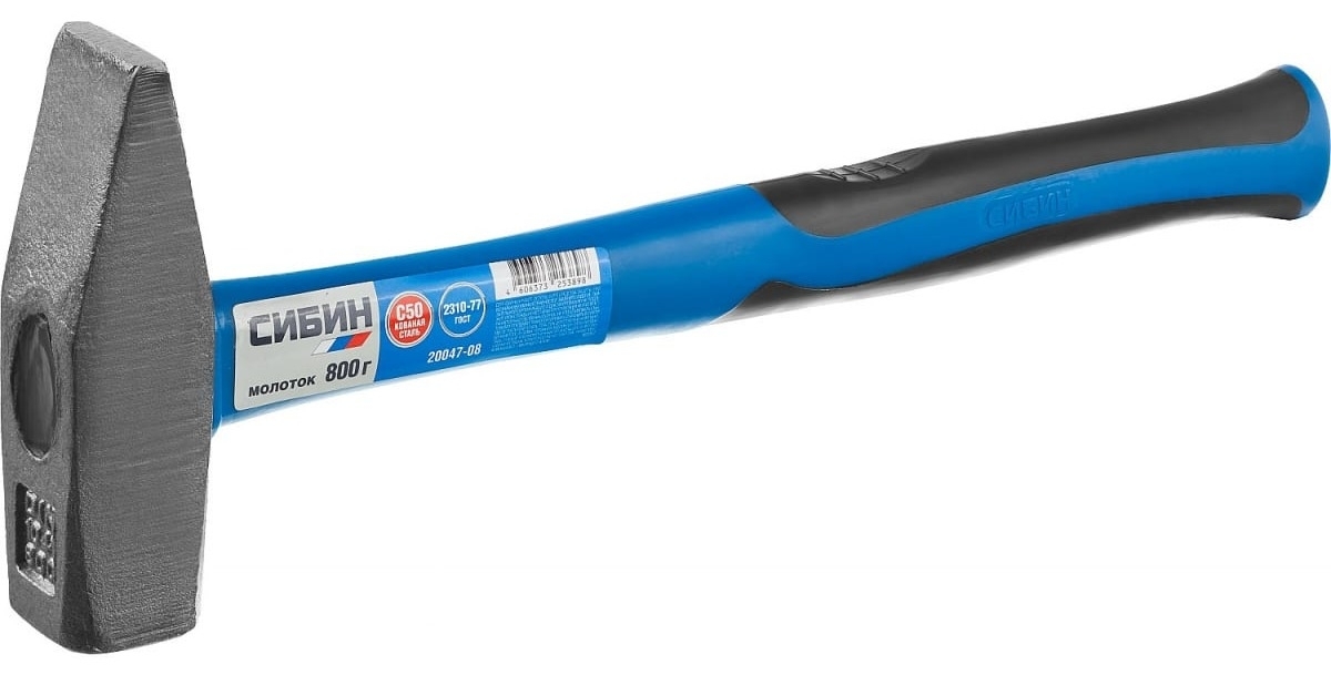 Молоток СИБИН слесарный, с обрезиненной фиберглассовой ручкой, стальной боек, серый, 800г / инструменты для ремонта и строительства