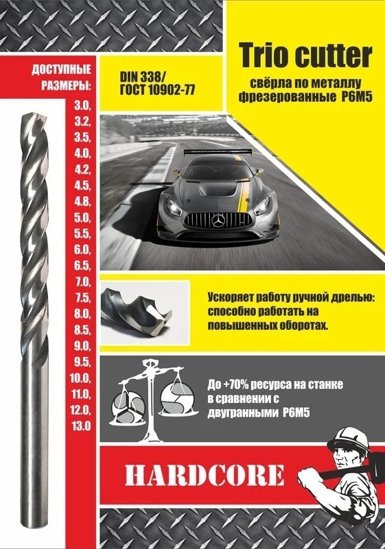 Сверло по металлу Hardcore / Хардкор Trio Cutter спиральное из быстрорежущей стали Р6М5, диаметр 4мм, длина 75мм / оснастка