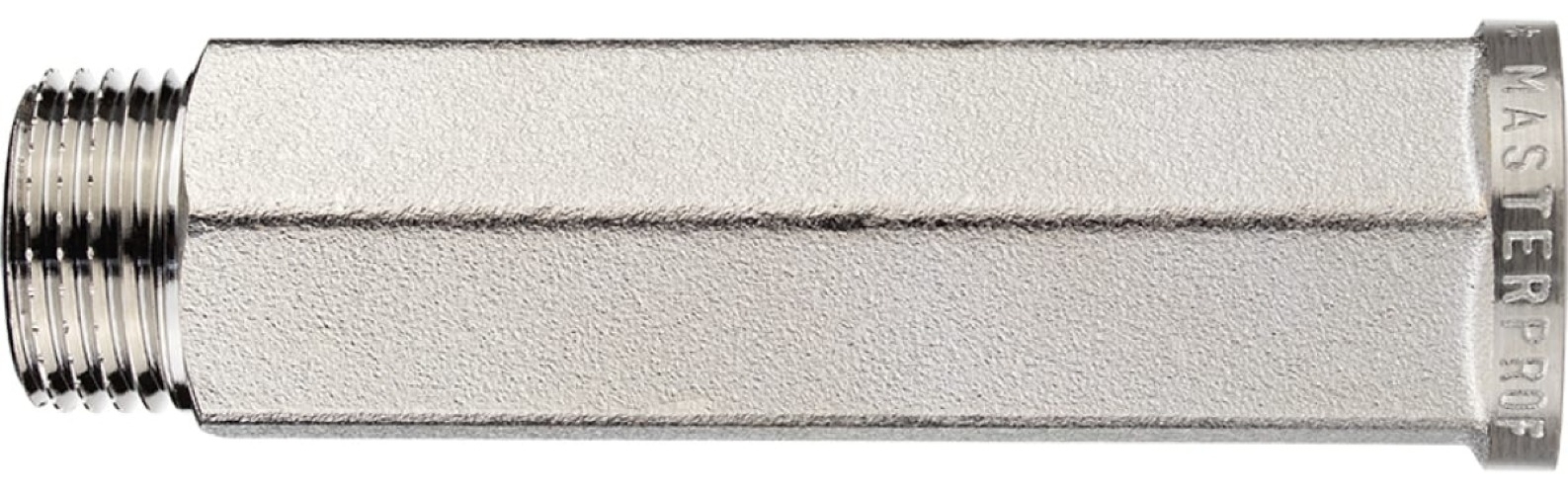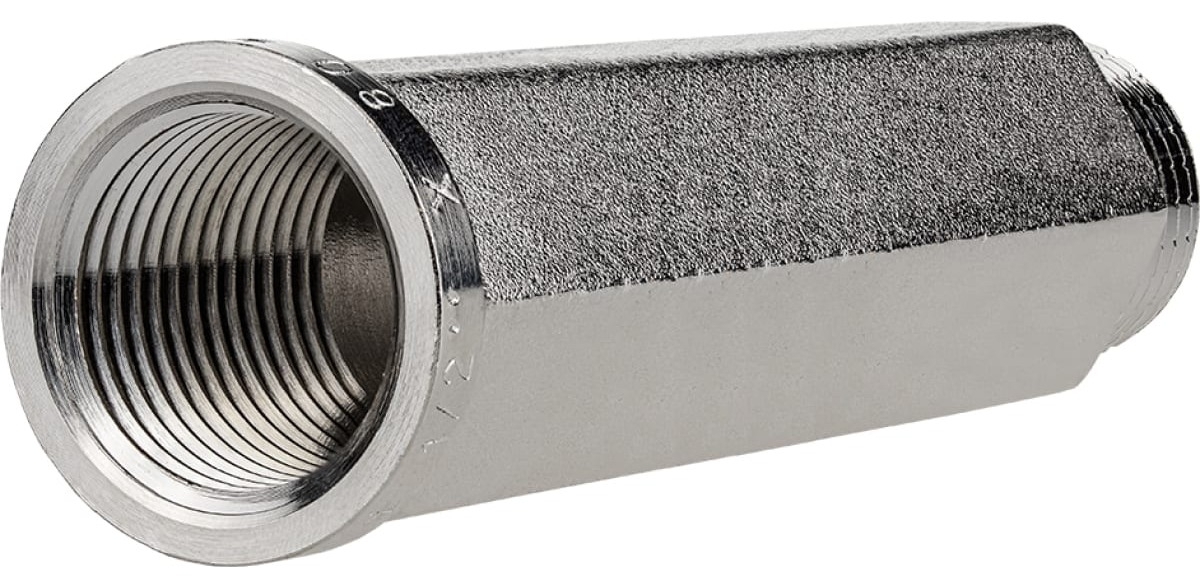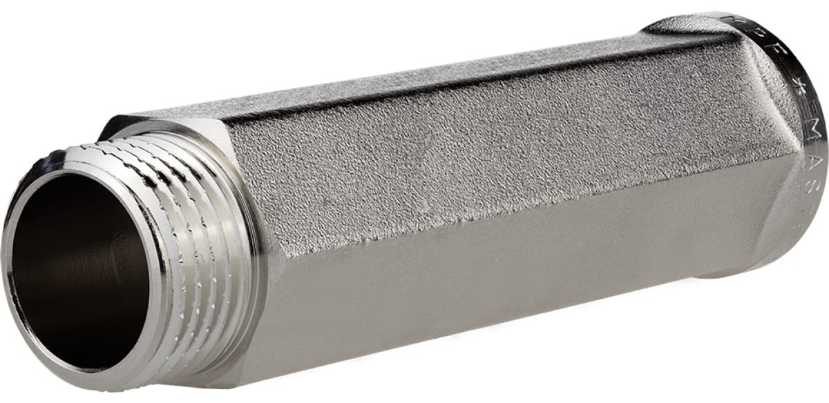 Удлинитель шестигранный 1/2" х 80 мм никель MPF ИС.072801 соединительный элемент трубопровода с внутренней и наружной резьбами одинакового диаметра. Монтаж не потребует специальных ключей благодаря шестигранной форме тела удлинителя.