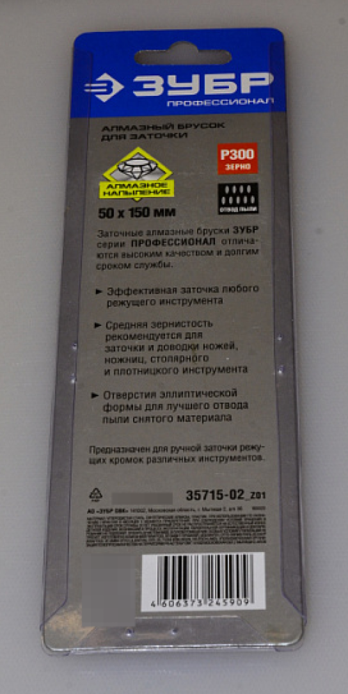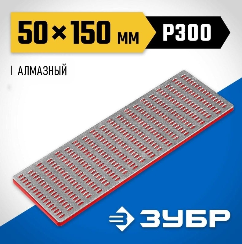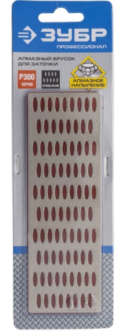 Брусок алмазный заточной ПРОФЕССИОНАЛ (50×150 мм; Р300) ЗУБР 35715-02_z01 применяется для заточки и финишной доводки ножей, ножниц, столярного и плотницкого инструмента. Перфорация защищает поверхность пластины от забивания частицами абразивной и металлической пыли.