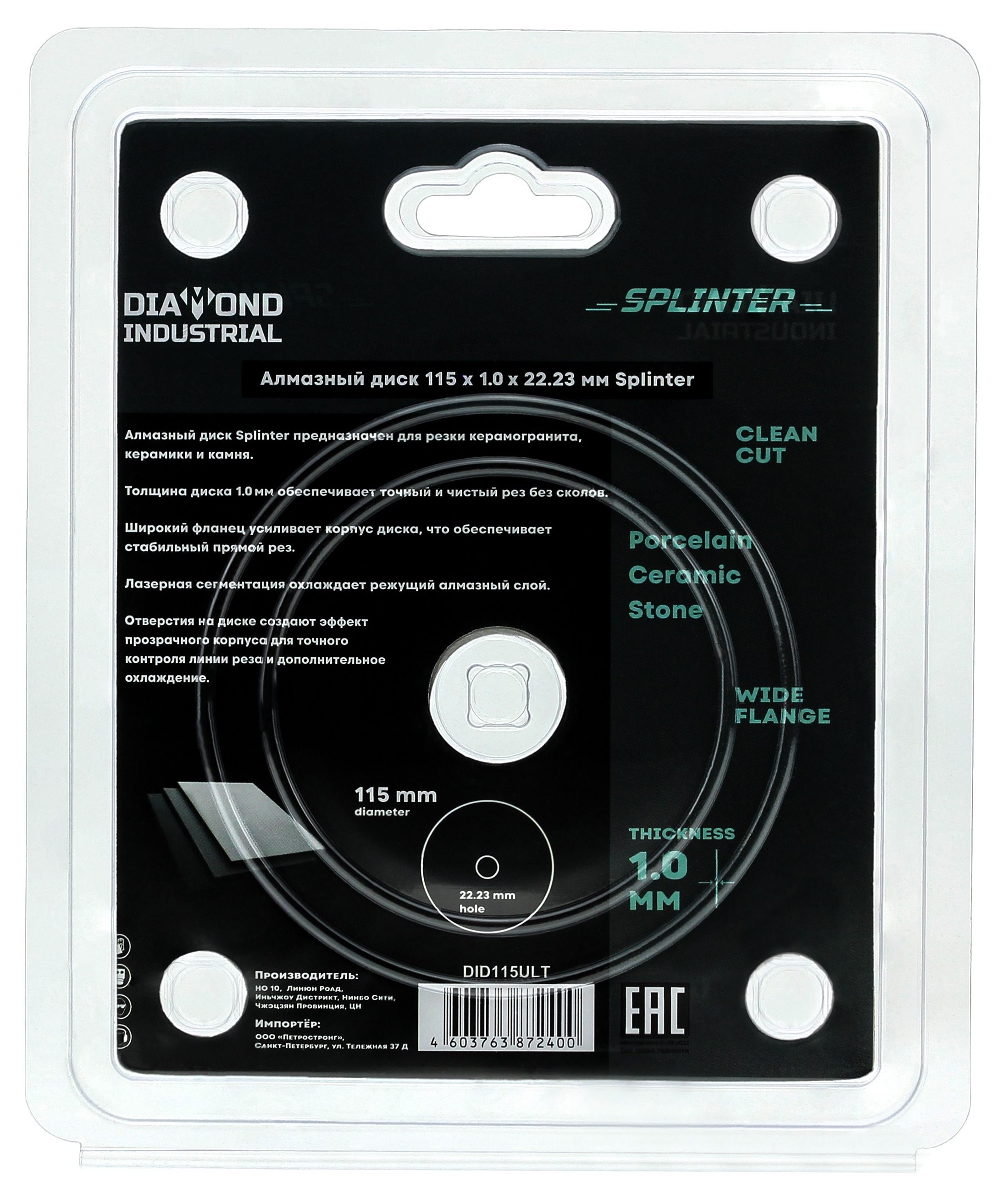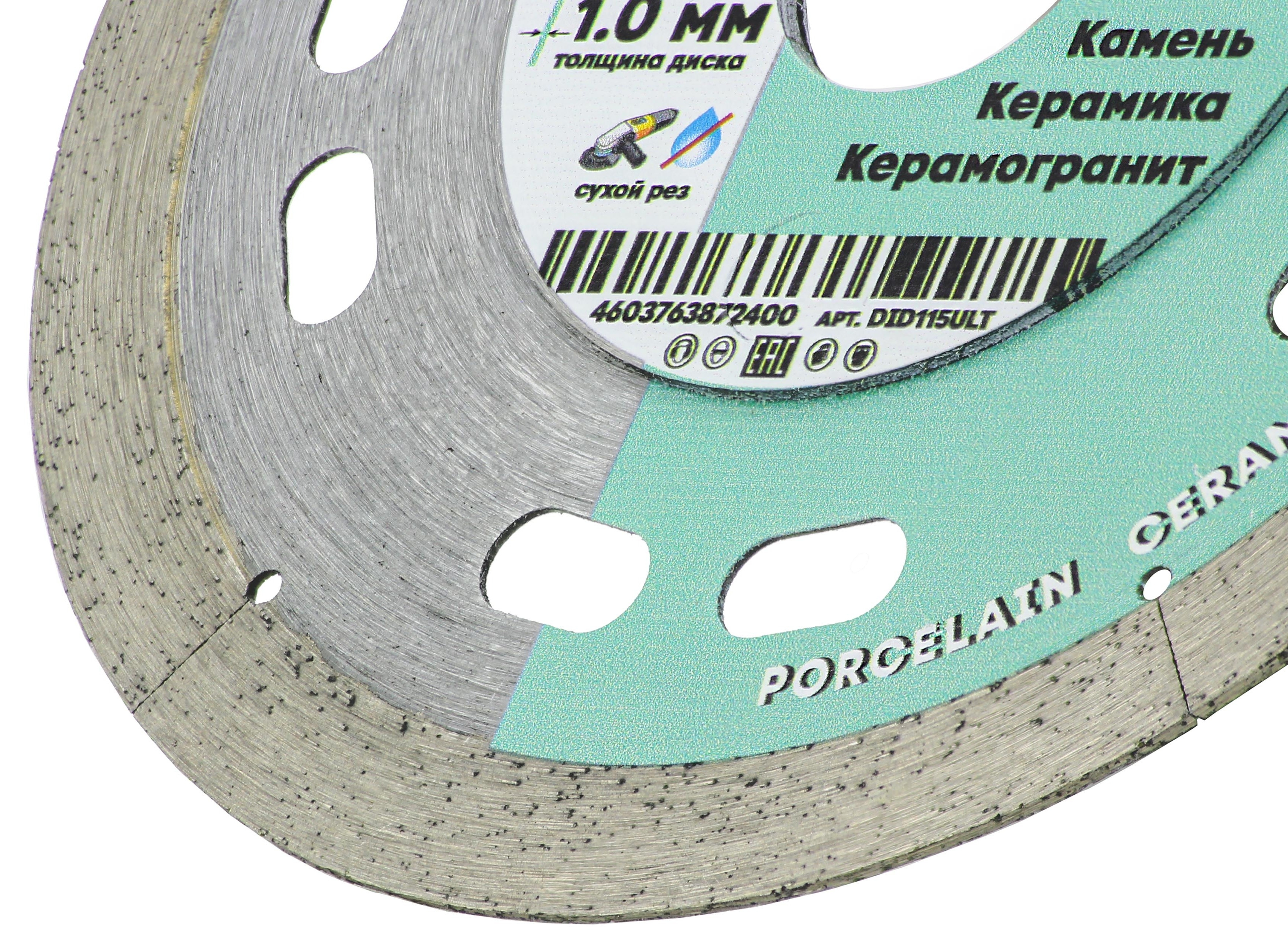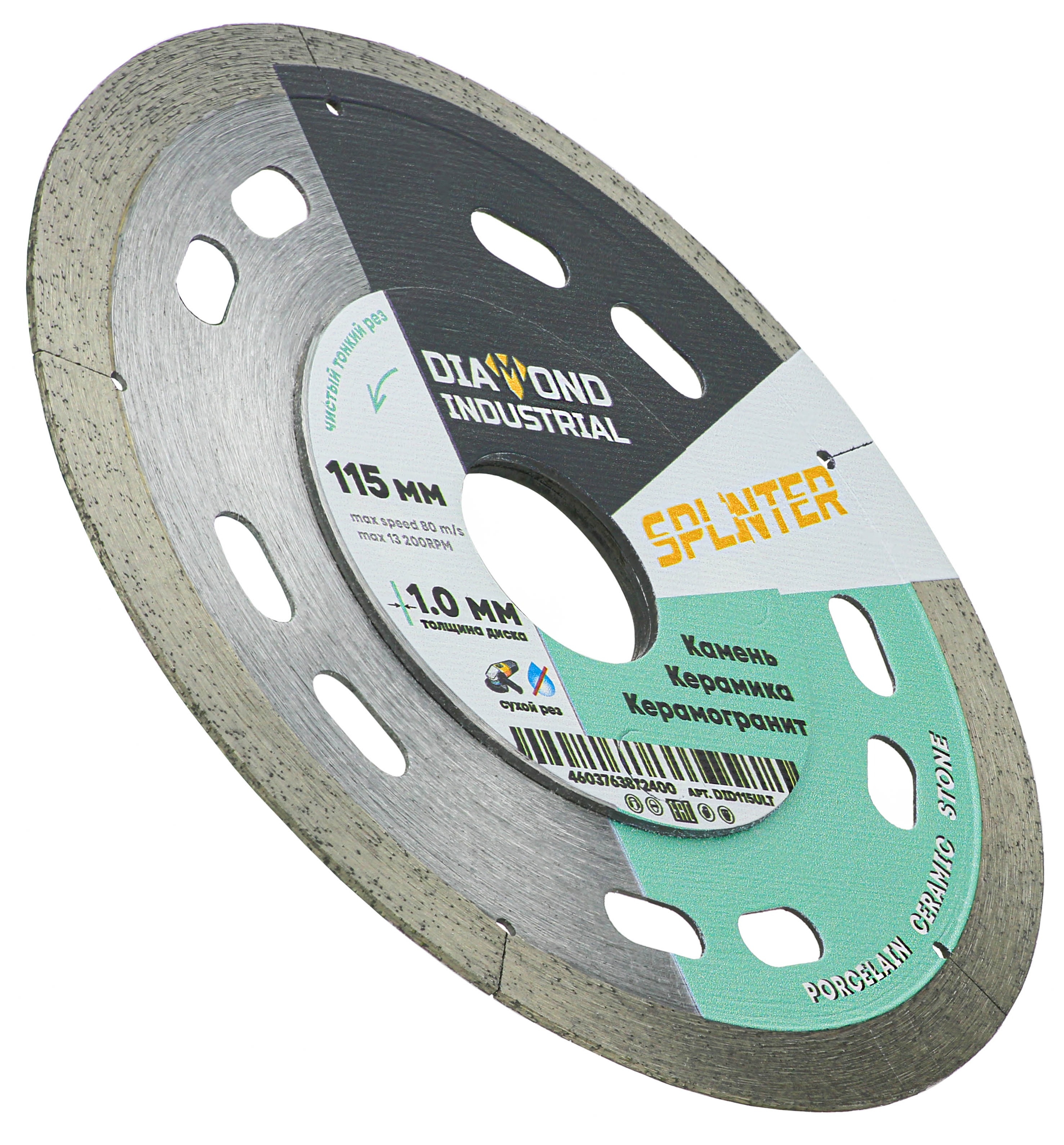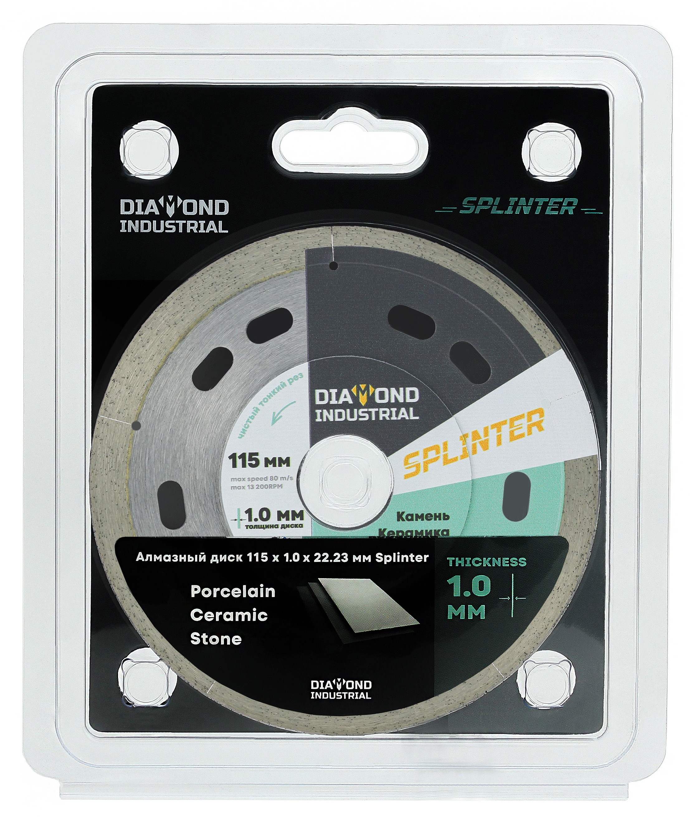 Диск алмазный ультратонкий 115х8х1.1х22,23 SPLINTER Diamond Industrial (DID115ULT) Ультратонкий 1.0 мм алмазный диск по керамограниту Диск предназначен для высококачественной резки керамогранита, керамической плитки, камня. Диск имеет ультратонкий алмазный слой 1,0 мм., что позволяет выполнять сверхточные и деликатные резы. Диск оставляет чистейшую кромку на всех видах плитки, в том числе с глазурованным покрытием. Корпус диска усилен фланцем диаметром 60 мм, что обеспечивает уверенный рез твердого керамогранита. Устанавливается на УШМ, работает без охлаждения!