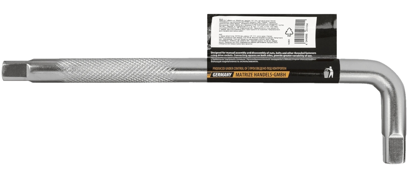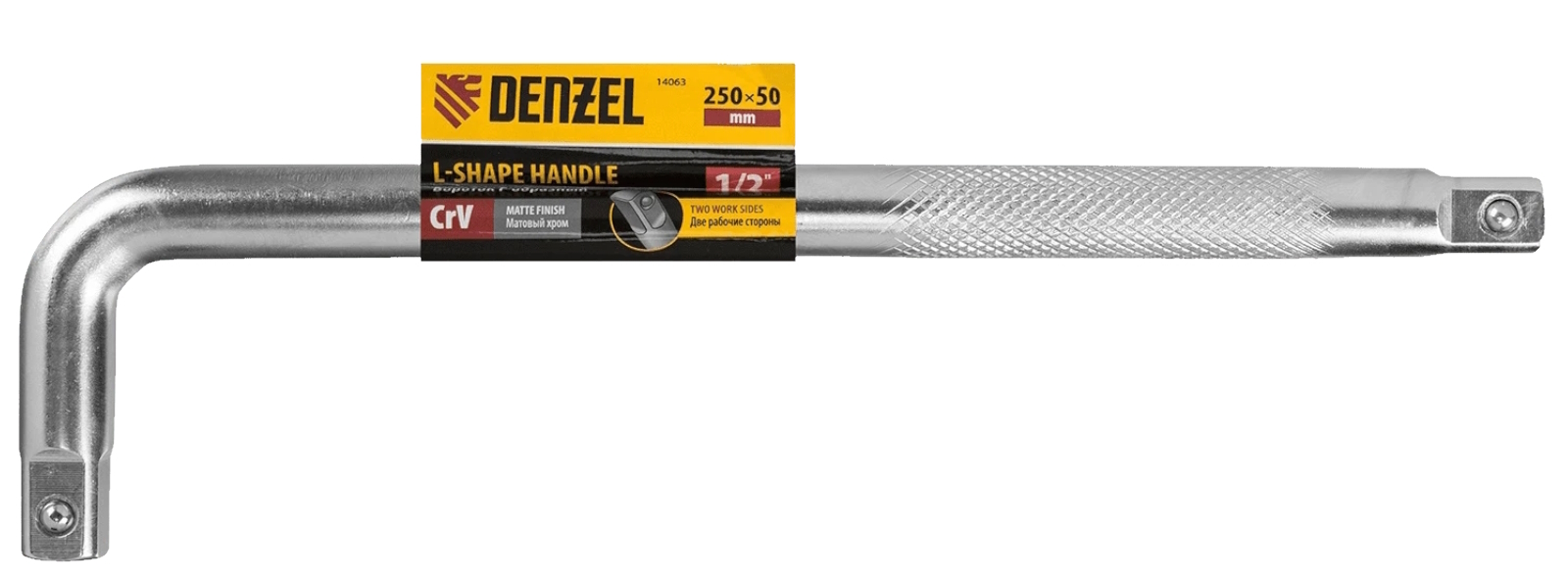 Г-образный вороток Denzel 14063 из стали CrV, размером 250×50 мм, с присоединительным квадратом ½», с покрытием «матовый хром», предназначен для ручного монтажа и демонтажа гаек, болтов и другого резьбового крепежа с помощью торцевых головок. Может использоваться в бытовой и профессиональной сфере: для ремонта велосипедов, автомобилей, станков.