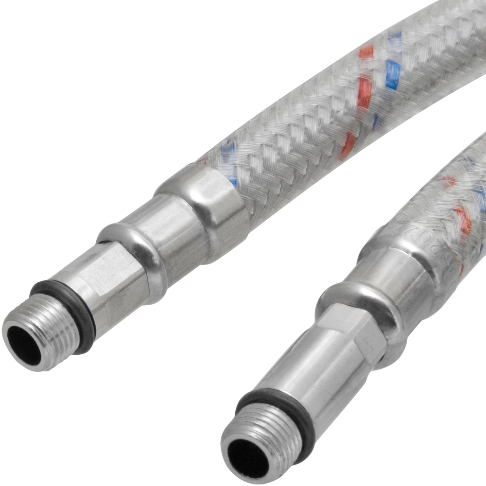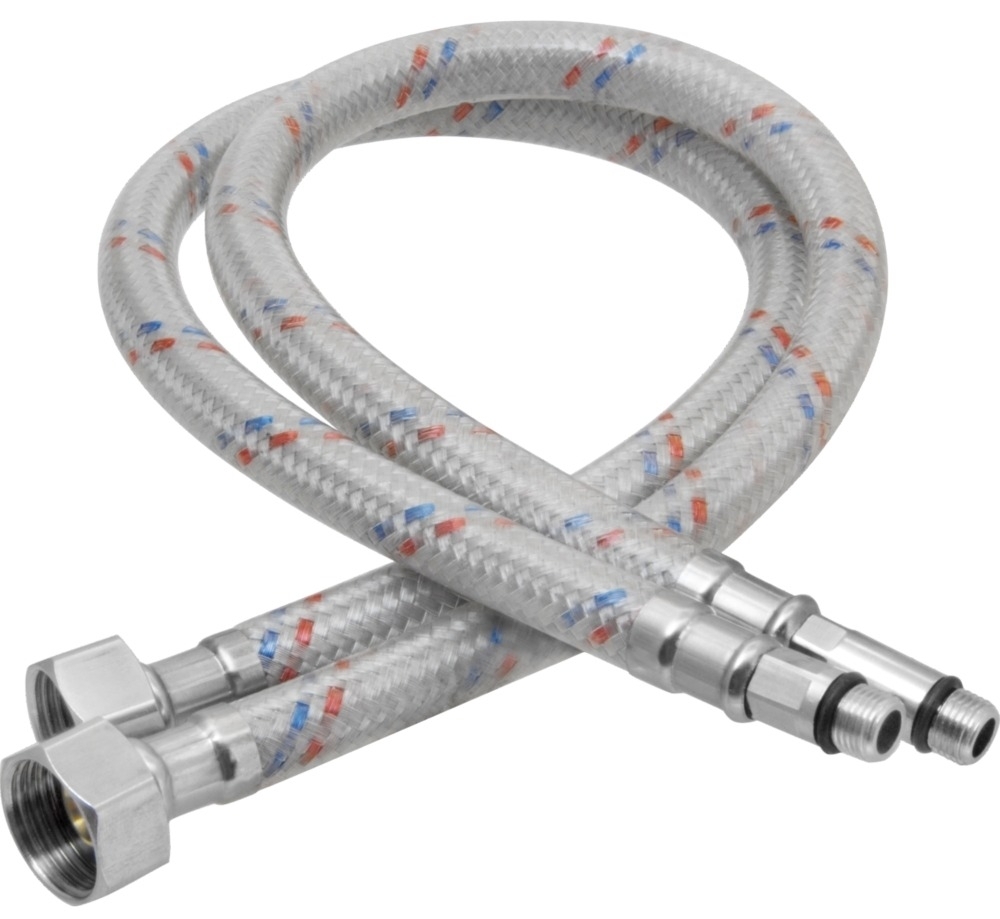 Гибкая подводка с двойным полимерным покрытием – предназначена для подключения сантехнического оборудования (смывных бачков, смесителей, водонагревателей, стиральных и посудомоечных машин) к трубопроводам системы гор/хол водоснабжения. Изделие представляет собой гибкий шланг, внутренняя трубка которого изготовлена из этилен-пропиленового каучука (EPDM), покрытого оплеткой из нейлона с поливинилхлоридным (ПВХ) покрытием. Накидная гайка и обжимные гильзы выполнены из нержавеющей стали, а штуцер и ниппель из латуни.