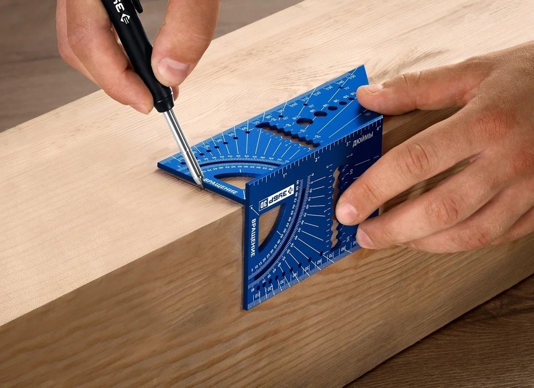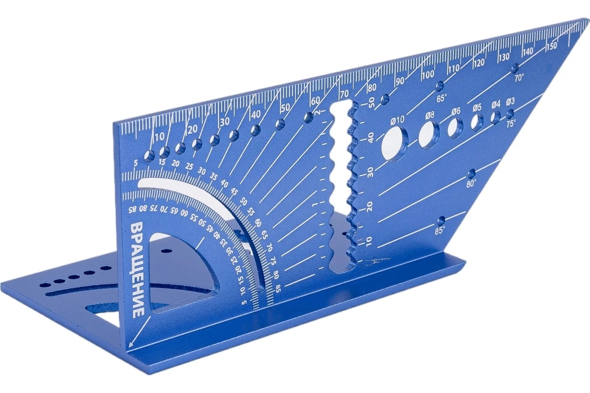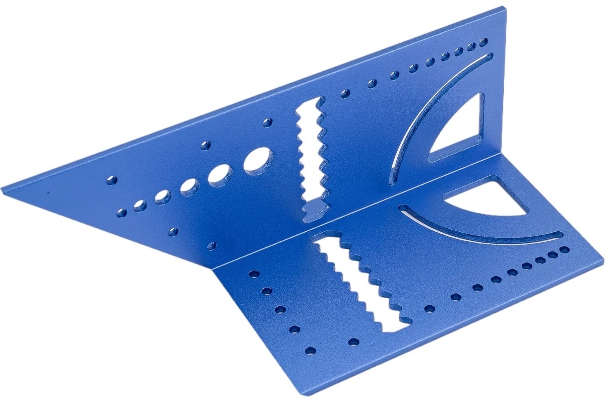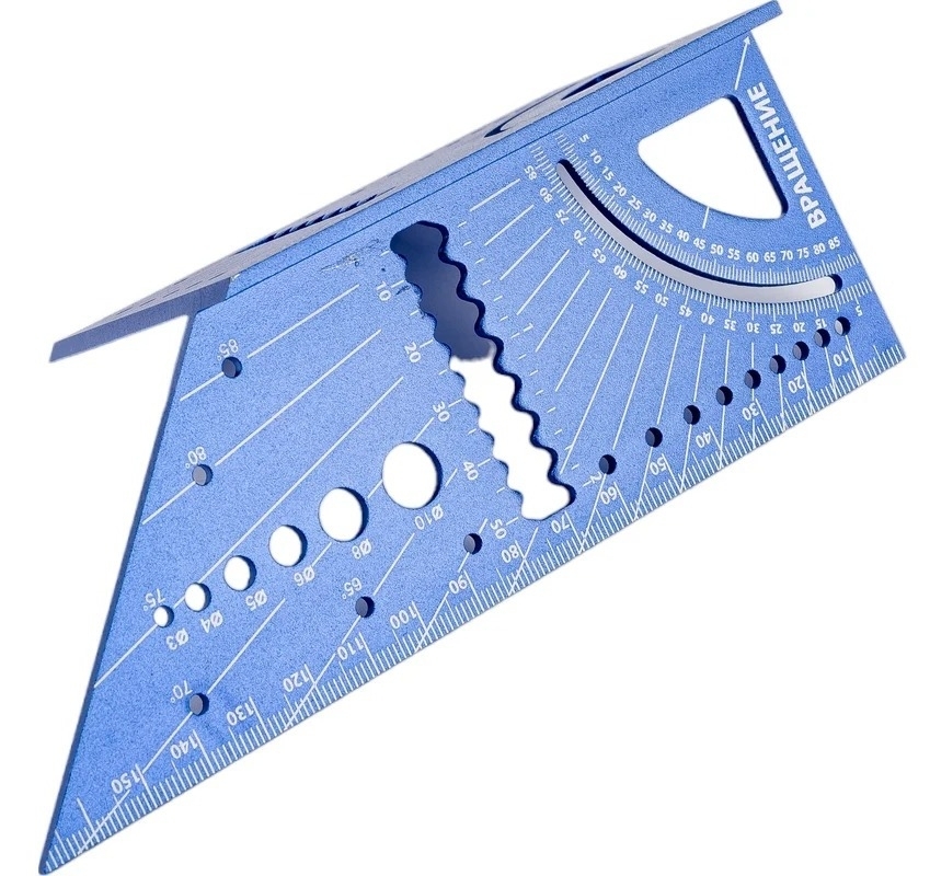 Данная модель — профессиональный универсальный кровельный угольник инструмент для точной разметки объёмных конструкций, таких как трубы, балки, направляющие. Имеет широкую область применения: разметка под углом 90 градусов, разметка под углом 45 градусов, разметка труб, рейсмус, транспортир, линейная разметка, определение размера сверла.