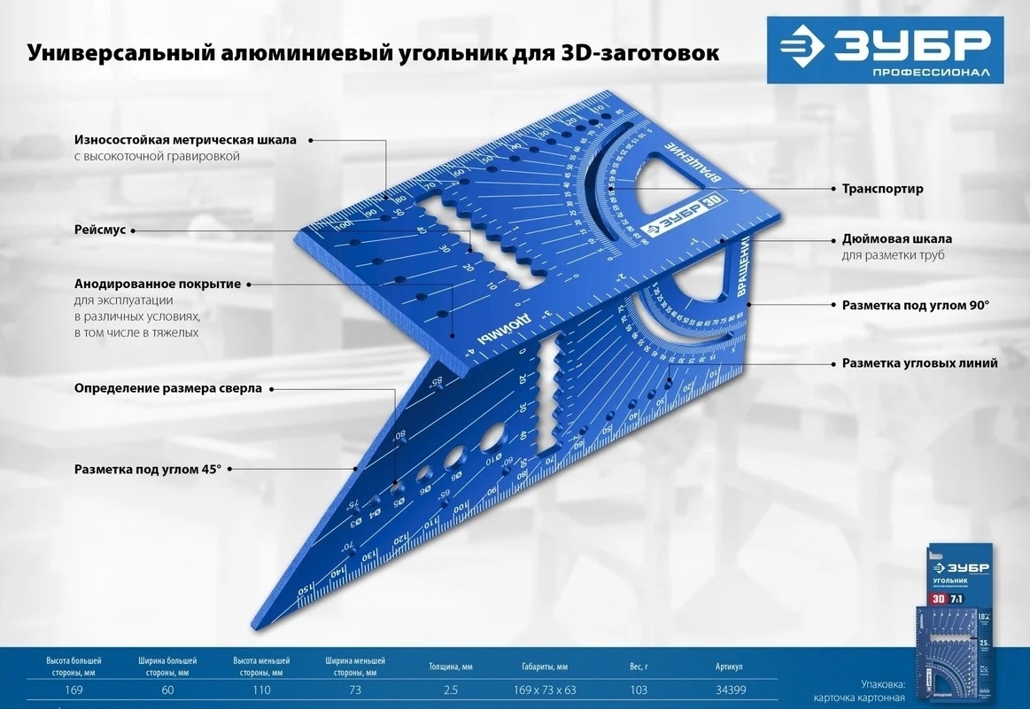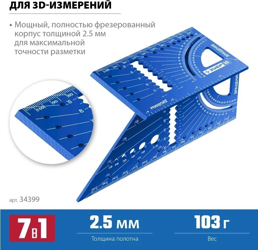 Угольник строительный Зубр Профессионал 3D 7-в-1 многофункциональный, алюминиевый, синий, размером 169х110мм / инструменты