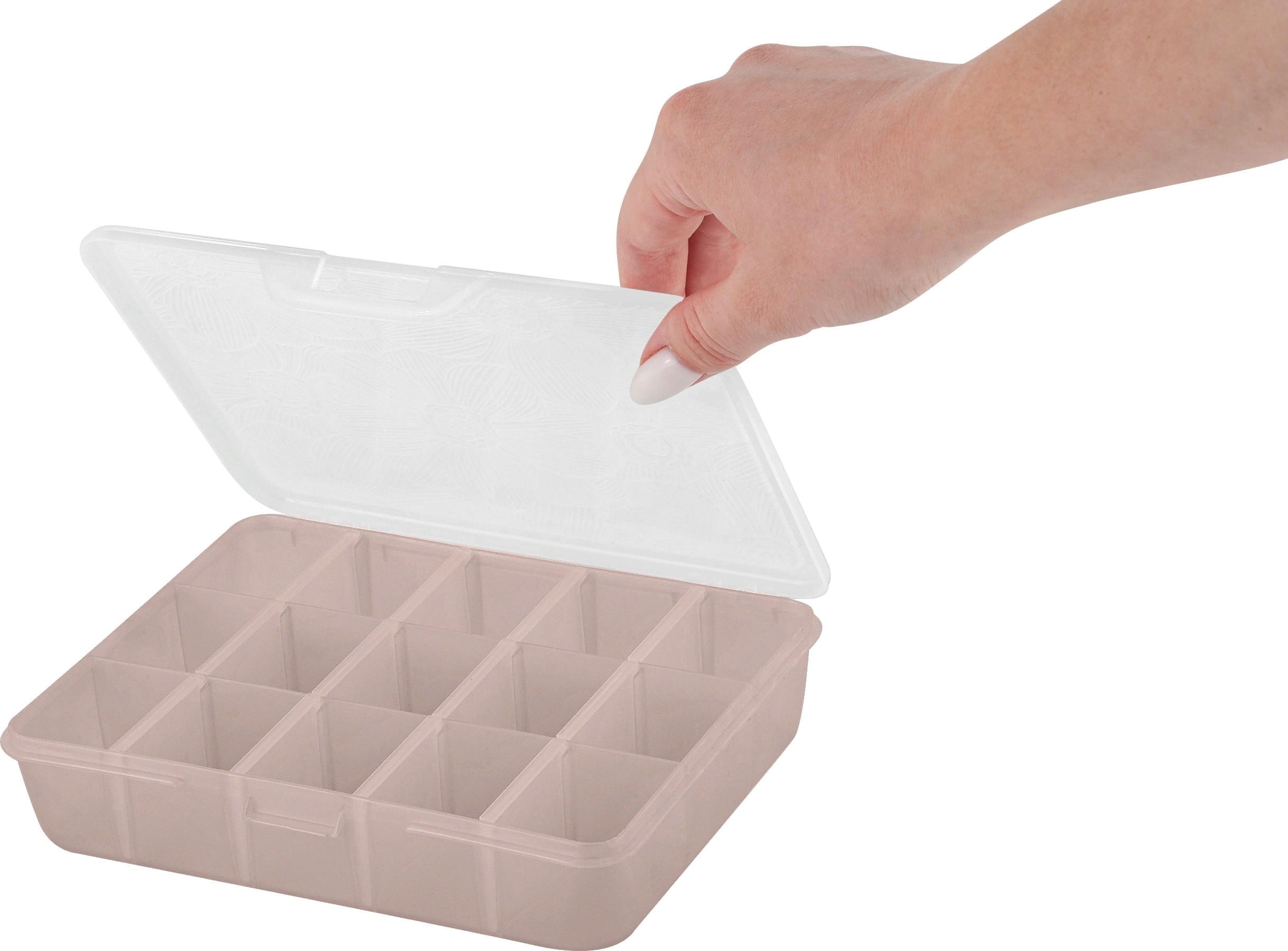 Органайзер для мелочей Keeplex Fiori с разделителями KL401510005 эффективно и без излишних затрат поможет организовать хранение всех домашних мелочей, в одном стиле и в одном месте, чтобы ничего не потерялось. Для ниток и иголок, бижутерии и косметики, таблеток и товаров для творчества - для каждой домашней мелочи найдется свое место. Уникальный дизайн крышечки выделяет органайзер на фоне всевозможных аналогов – флористический тонкий фактурный рисунок на прозрачном корпусе не оставит равнодушной ни одну женщину.
