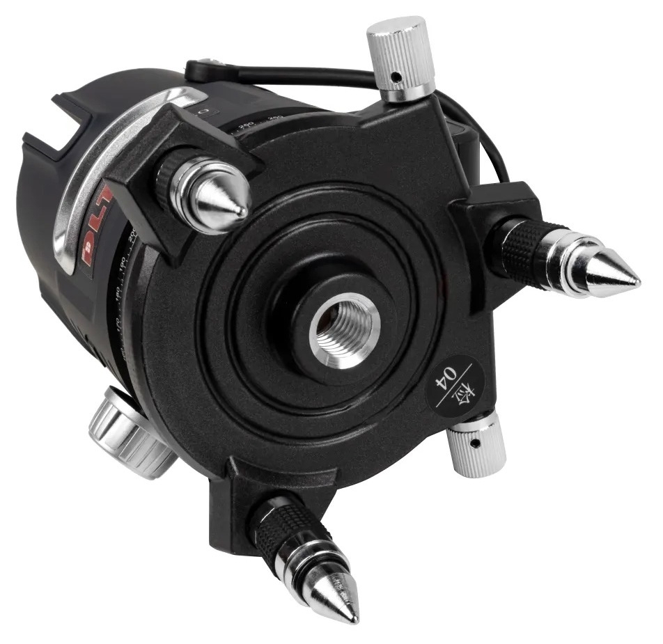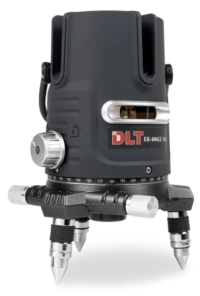 Самовыравнивающийся лазерный уровень DLT EK-400GX PRO проецирует с погрешностью не более ±0,2 мм/метр, 4 вертикальные линии с разверсткой 200°, 1 горизонтальную линии с разверсткой 120° (за счет поворотного основания можно «отбиться» все 360°), 4 горизонтальных точки, 1 вертикальную точку, 1 точку отвеса.