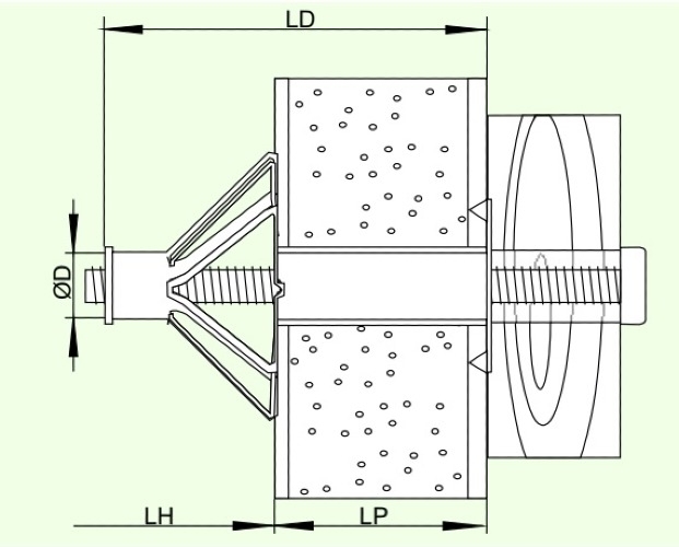 Свойства: многосекционный дюбель с предварительно вмонтированным винтом с метрической резьбой; легкий монтаж с помощью отвертки или специальных монтировочных клещей; раскрывающиеся упорные крылья обеспечивают большую площадь упора и достижение оптимальных усилий извлечения; винт может быть вывернут и использован вторично без уменьшения несущей способности крепления дюбеля к плите; комплектуется винтом с метрической резьбой: с крестообразным шлицем, с крюком, с полукольцом, с кольцом.