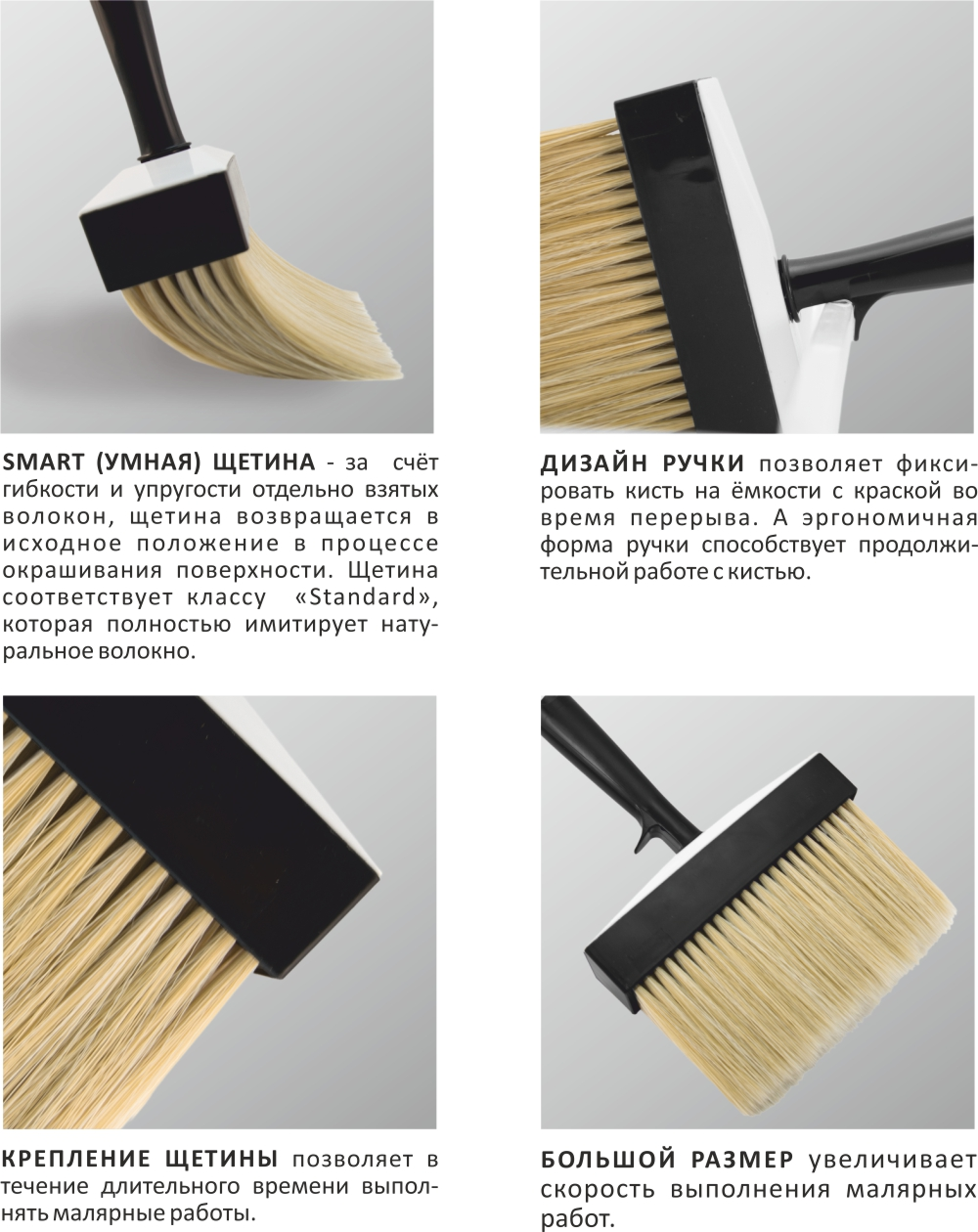 Главная особенность кисти ракли — это большое внутреннее пространство, способное удерживать значительный объем краски, который затем отлично распределяется по поверхности. Конструкция ракли препятствует образованию брызг в работе, поэтому такая кисть позволяет получить идеально гладкую поверхность.