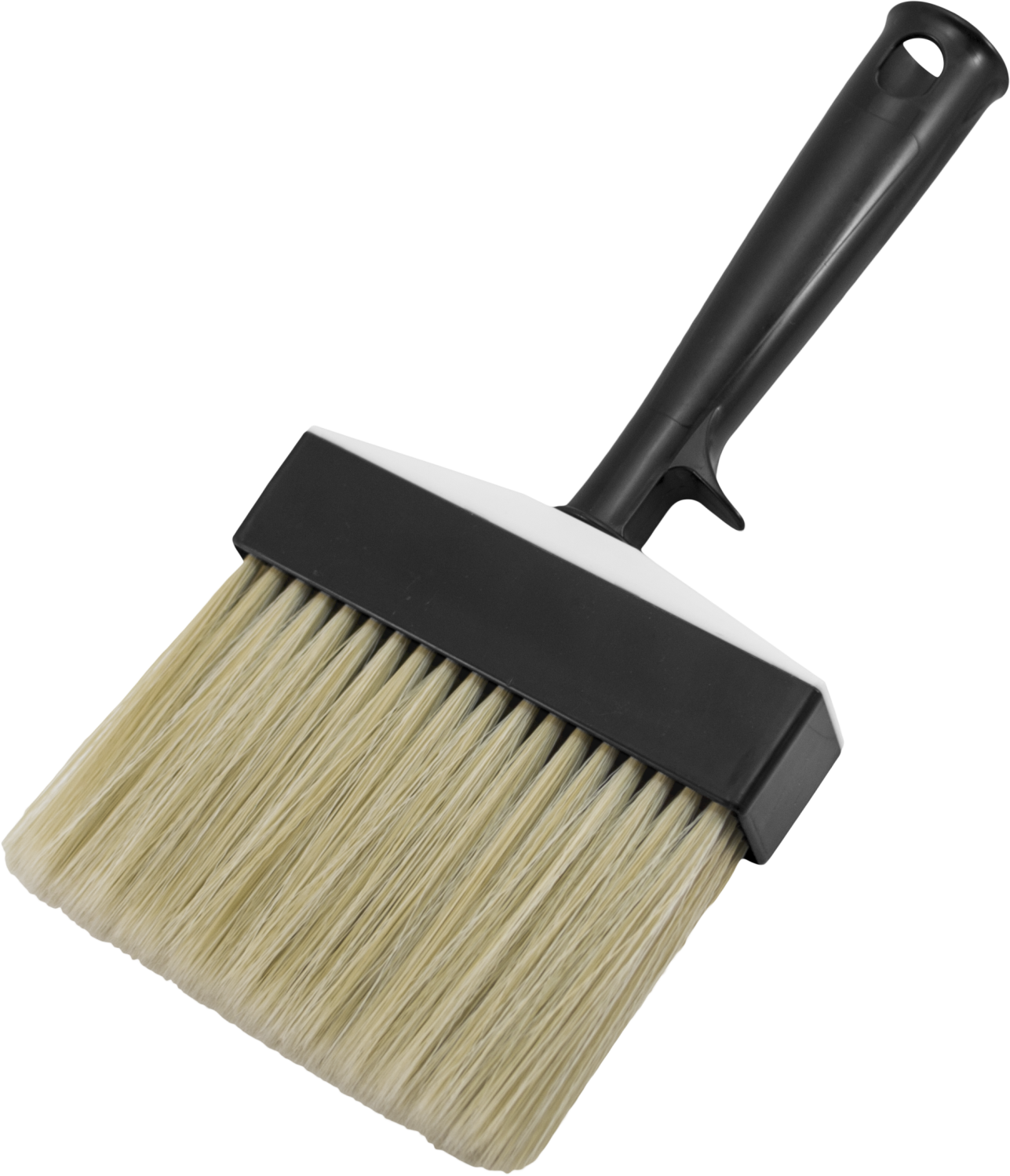 Рабочая часть кисти изготовлена из смешанной светлой щетины. Кисть наносит краску равномерно и аккуратно. Пластмассовая рукоятка оснащена отверстием для подвески и крюком для крепления на ведро. Может использоваться с удлиняющими стержнями для покраски труднодоступных мест и высоко расположенных поверхностей.