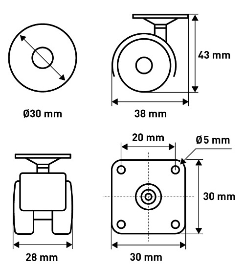 Мебельное колесо Larvij / Ларвидж LWP-30 двойное, поворотное, на платформе, пластиковое, черное, диаметр 30мм / фурнитура