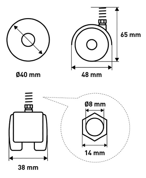 Поворотное колесо черного цвета LWT-40 — изделие декоративного типа, используемое в мебельном производстве. Его устанавливают на журнальные столики, небольшие тумбы, пуфики и другую негабаритную мебель.