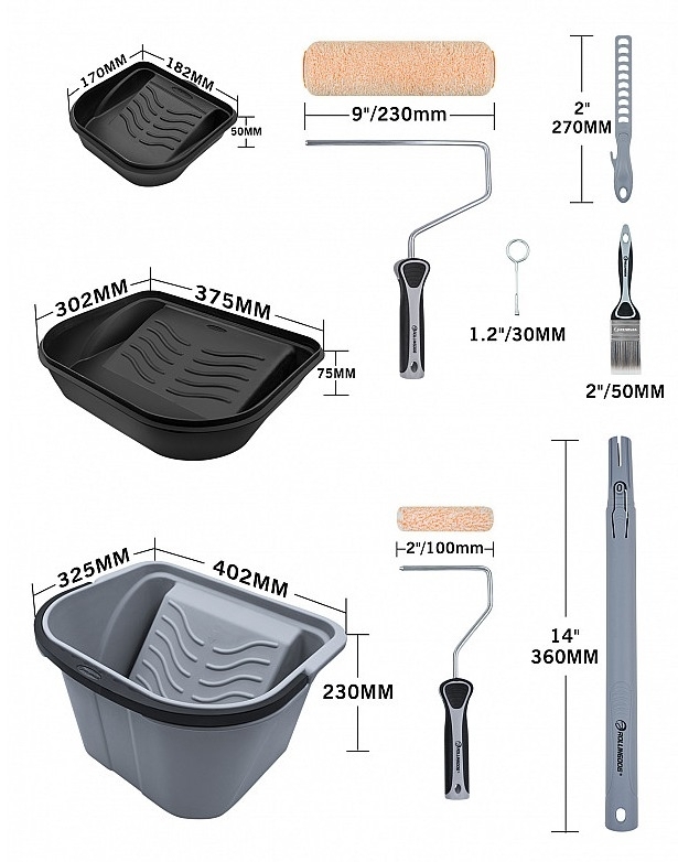 Набор включает в себя все необходимое для качественной и профессиональной покраске различных поверхностей.