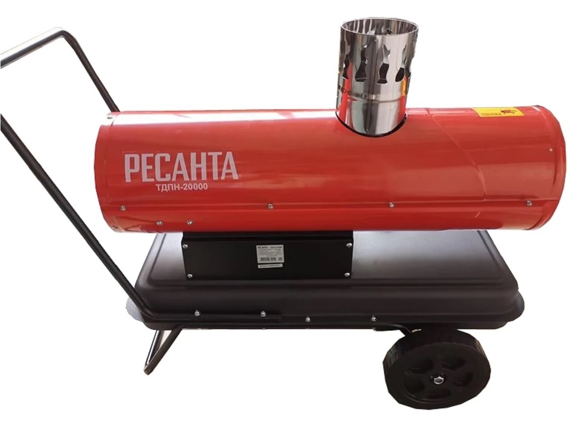 Мощная тепловая пушка Ресанта ТДПН-20000 с баком объёмом 36 л работает на дизельном топливе и подходит для обогрева нежилых помещений: складов, строительных объектов и производственных цехов. Теплопушка также может использоваться для усиления вентиляции. Ресанта ТДПН-20000 подходит для экономичного и быстрого обогрева помещений большой площади. Мощность дизельной теплопушки составляет 20 кВт. При этом её производительность достигает 800 м3/ч, а расход топлива — 1,58 кг/ч. Благодаря непрямому нагреву пушка также подходит для эксплуатации в помещениях с людьми. Для этого необходимо снабдить её системой отвода отработанных газов.