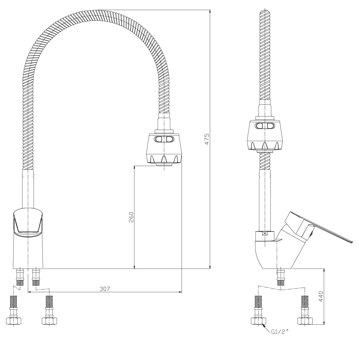Смеситель Rossinka Silvermix / Россинка Сильвермикс для кухни, однорычажный, из латуни, цвет хром, с режимом душ и гибким изливом 260мм / сантехника