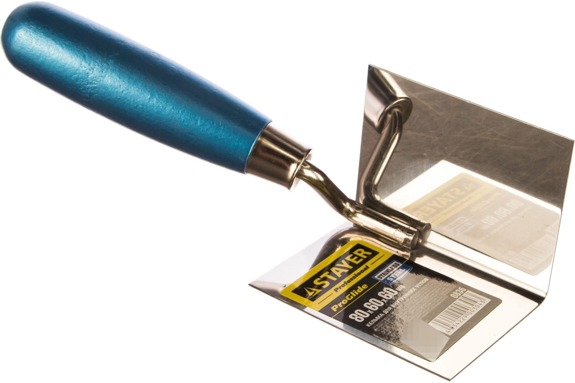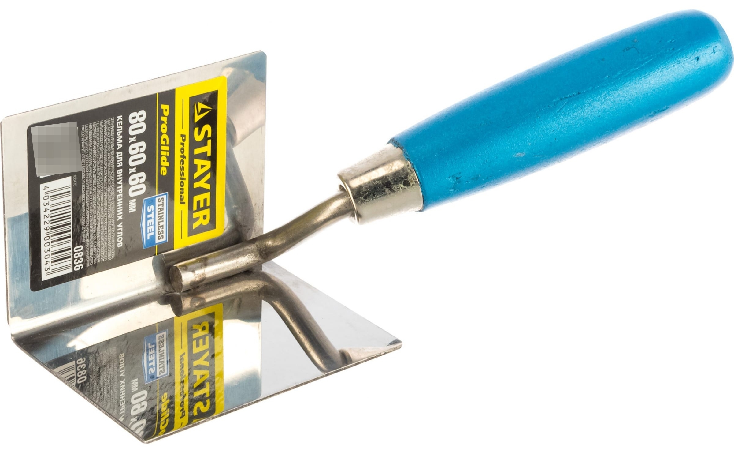 Кельма STAYER ЕВРО 0836 выполнена в форме угла и имеет размеры 80х60 мм. Эта кельма применяется для выравнивания внутренних углов при строительстве или отделке помещений. Полотно кельмы изготовлено из нержавеющей стали, что защищает его от коррозии.