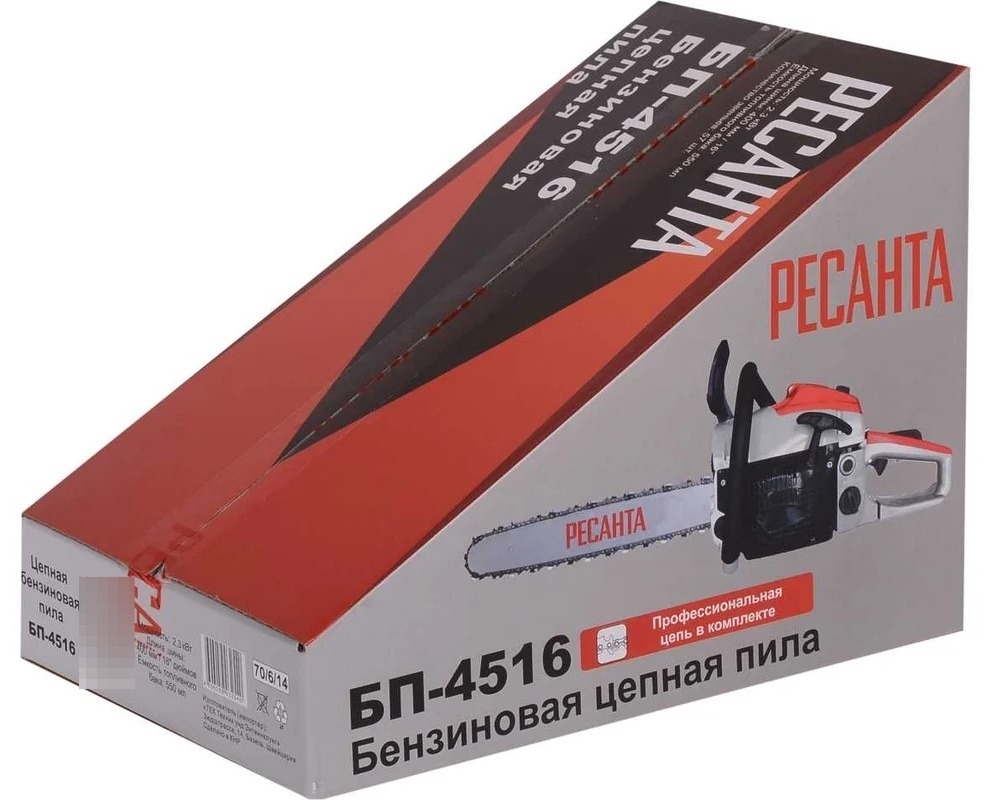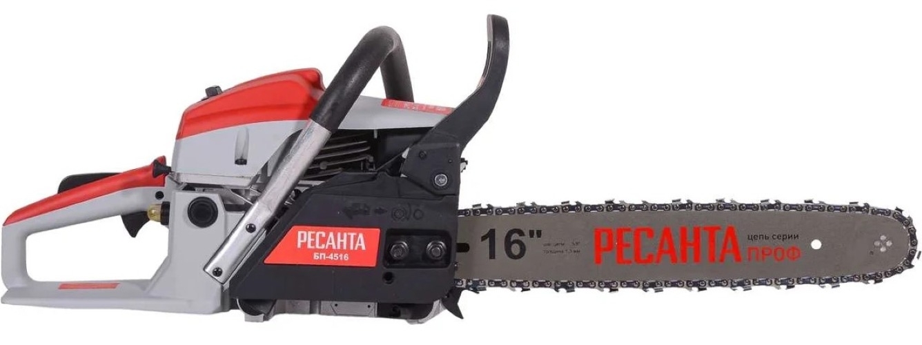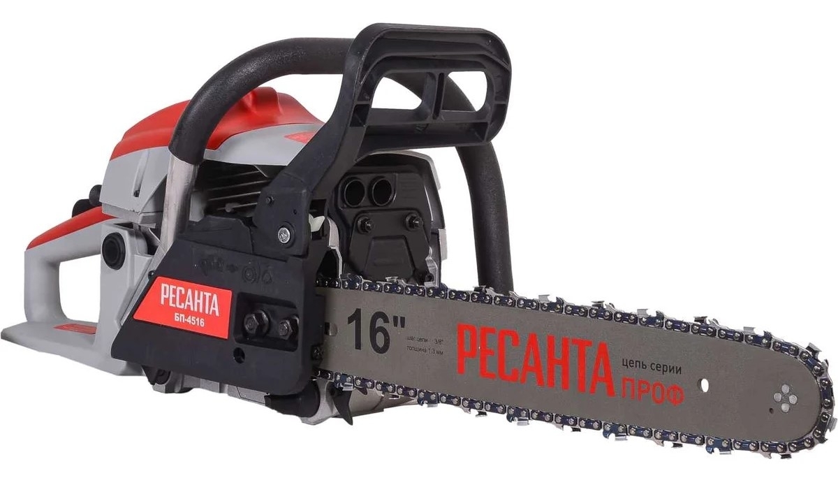 Бензопила Ресанта БП-4516 — инструмент, использующийся для валки деревьев, заготовки дров, распиловки бревен и бруса, обрезки веток в саду. Модель оснащена карбюраторным двигателем на 3,1 л. с., объемом 45 см³. Мотор работает на смеси бензина и масла для двухтактных двигателей. Используется топливный фильтр повышенной фильтрации. Емкость топливного бака: 550 мл. Модель имеет компактную шину длиной 400 мм, инструмент идеален для работ в труднодоступных местах. Цепь пилы смазывается автоматически, с помощью специального масляного насоса. Механизм натяжения цепи расположен сбоку, обладает легкой настройкой. Цепь оснащена тормозной системой, поэтому пользователь пилы защищен от случайных отскоков инструмента.