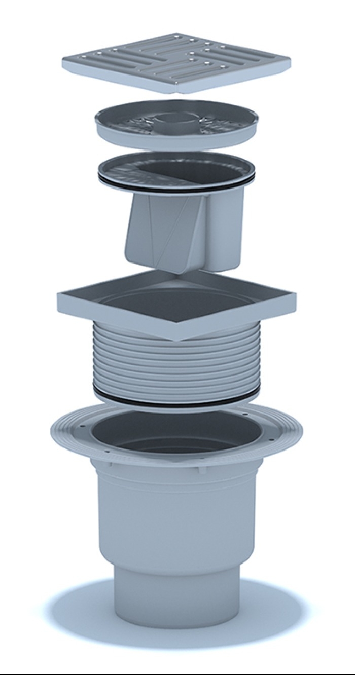 Трап для душа Анипласт 110 вертикальный слив, регулируемый из пластика и нержавеющей стали сухой, серый, размером 15х15см / водоотведение и канализация