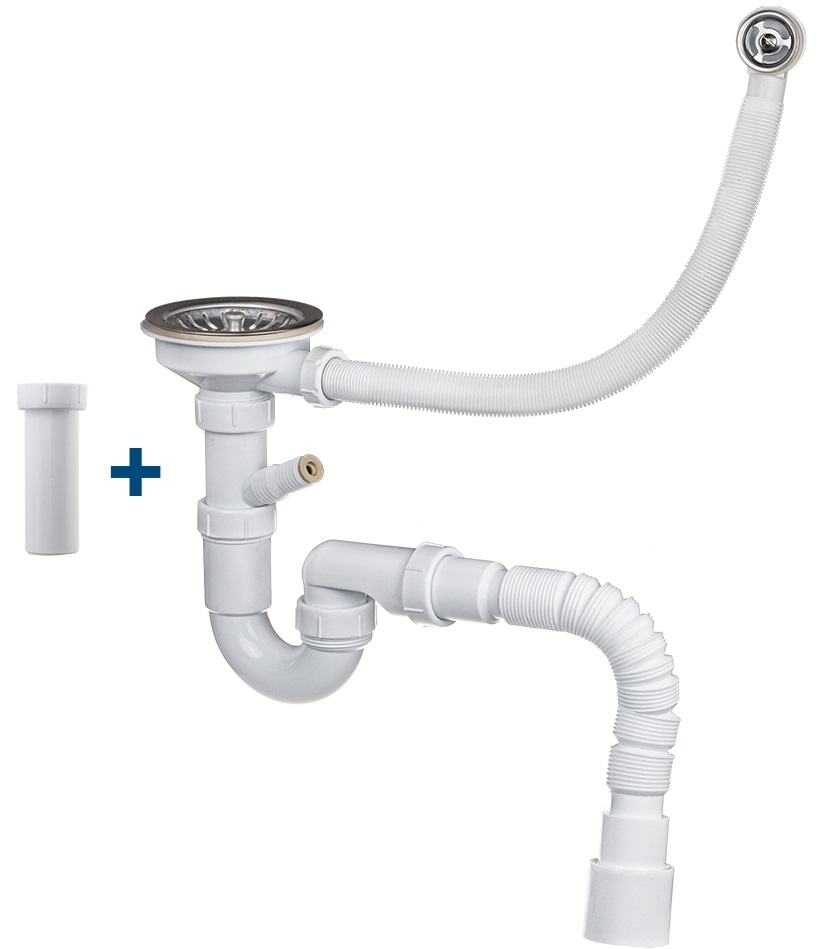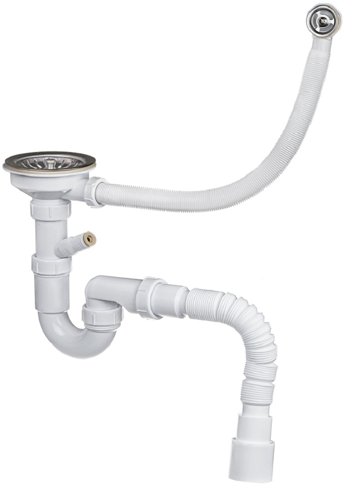 Сифон бутылочный для кухонной мойки 2 в 1, резьба для подключения выпуска 1 1/2", нержавеющая решётка 70мм, в комплекте 2 патрубка с отводом под стиральную машину и без, что делает сифон универсальным, позволяя выбрать нужную для подключения комплектацию, гофро-труба с выходом 40/50. Основной частью сифона является колба, в которой скапливаются крупные частицы бытовых отходов. Благодаря бутылочной конструкции устройство можно прочистить просто открутив резервуар и не производя полного демонтажа.