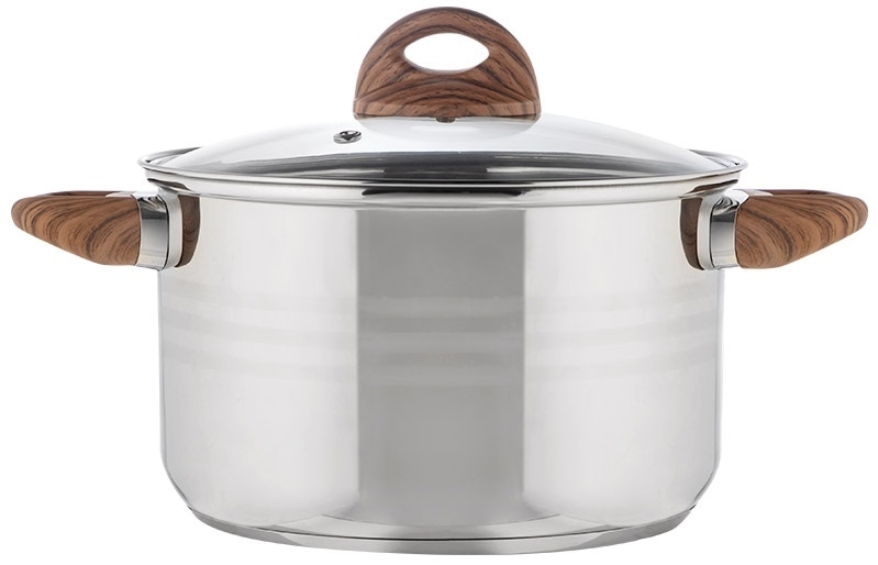 Кастрюля FORESTA имеет объём 5 л. Изготовлена из нержавеющей стали с крышкой с ручками под дерево soft-touch.
