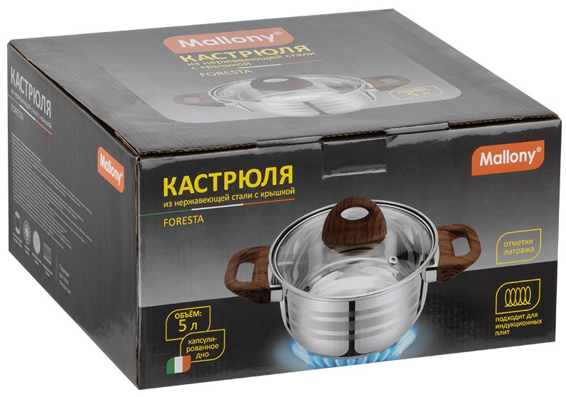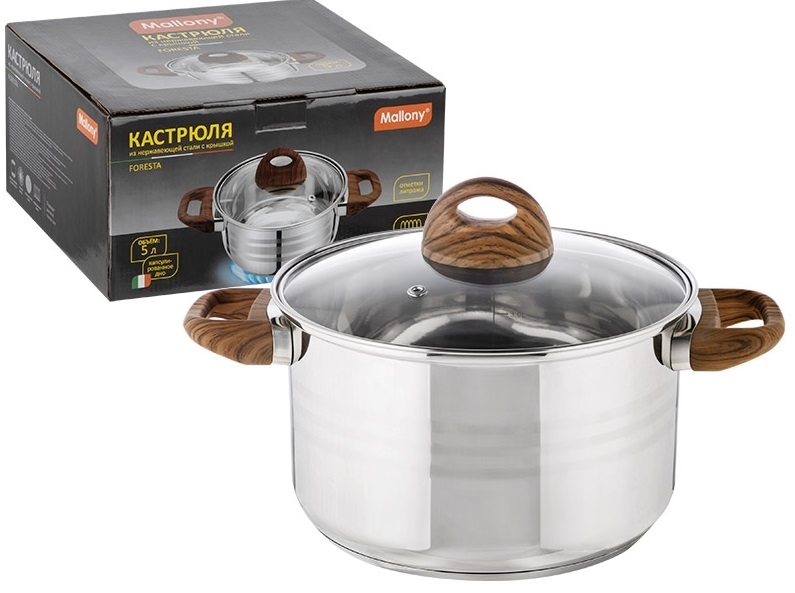 Кастрюля Mallony / Маллони FORESTA с крышкой, из нержавеющей стали, диаметром 22см, высотой 13.5см, объемом 5л / посуда для кухни