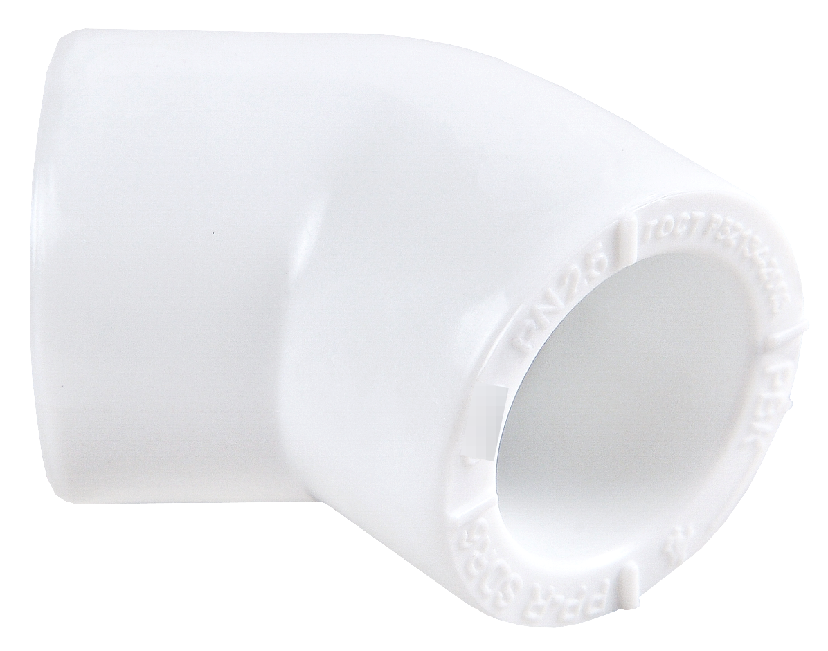 Колено предназначено для изменения направления трубопровода на угол 45 градусов в системах холодного, горячего водоснабжения и отопления. Для изменения направления трубопровода на 45 градусов применяется угол. Данный фитинг соединяет трубы одинакового диаметра. Фитинг можно использовать в системе как холодного так и горячего водоснабжения, центрального отопления, для распределения воздуха, при прокладке технологических трубопроводов.